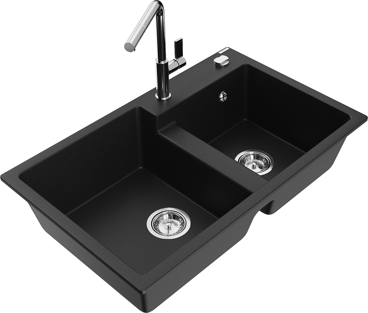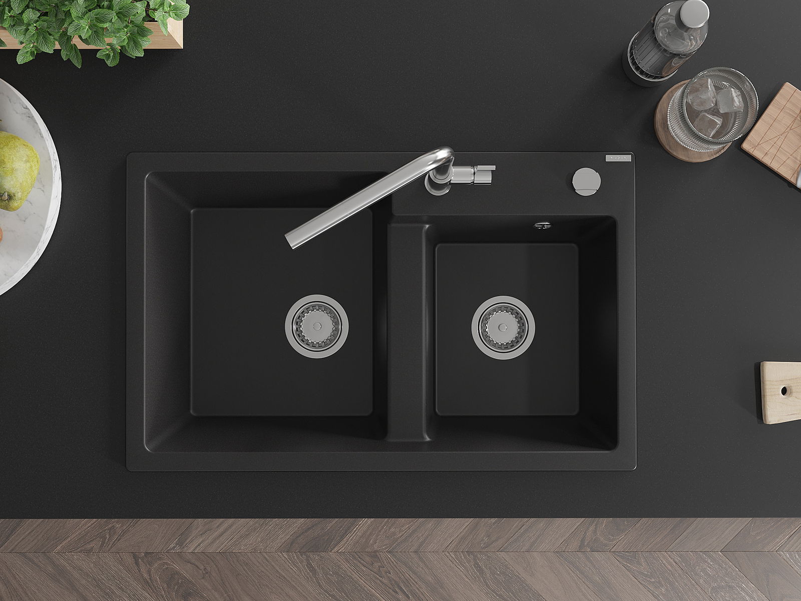 Mexen Tomas двоен кухненски мивка от гранит с кухненски смесител Flora, черен - 6516-77-670401-00