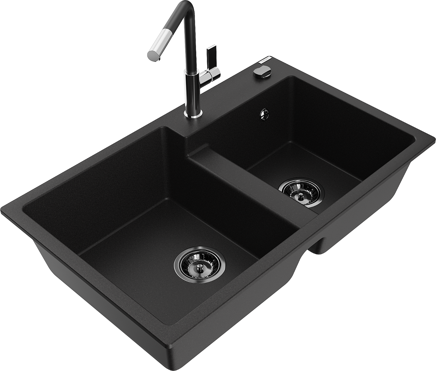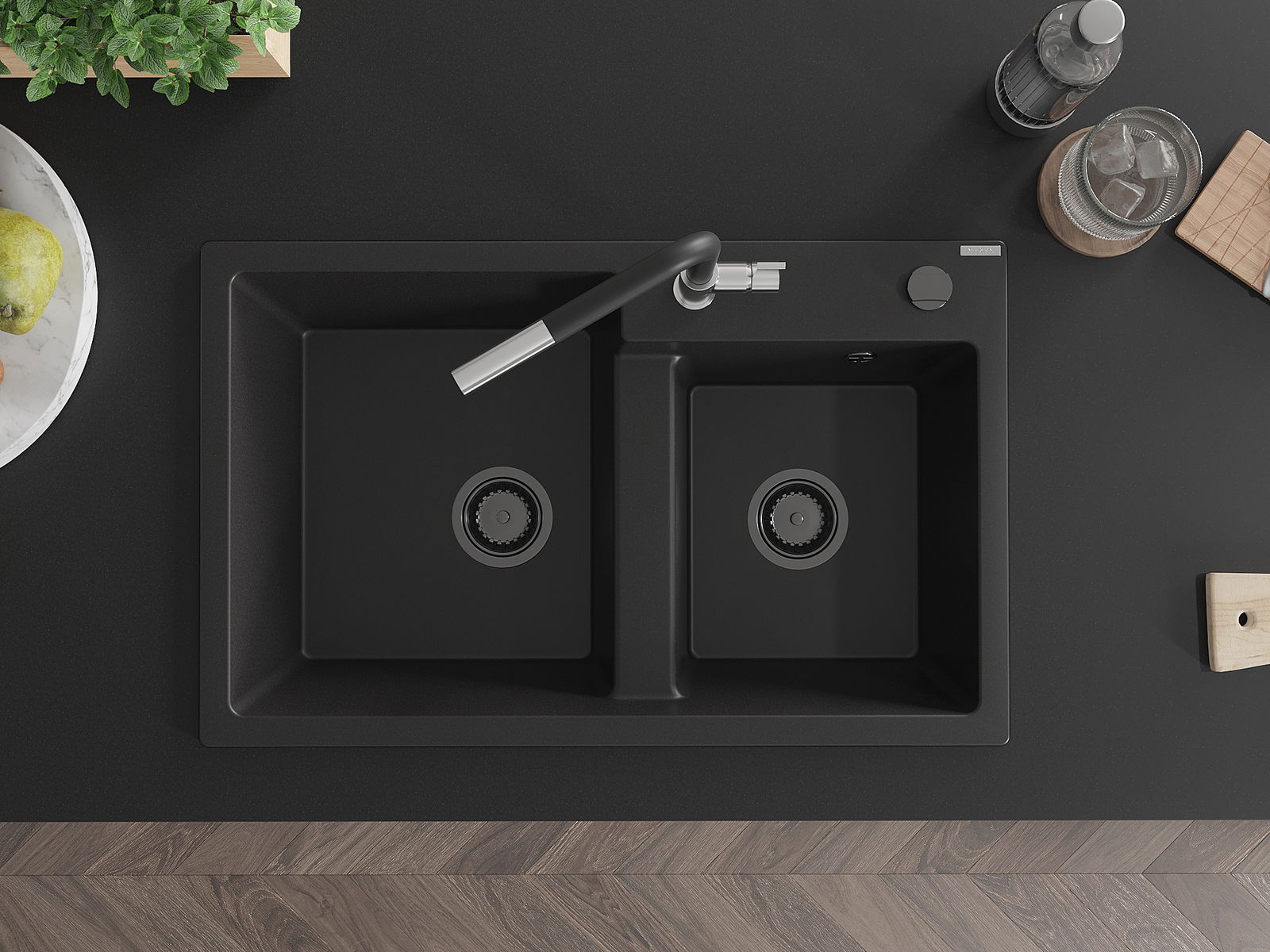 Mexen Tomas гранитна мивка с 2 камери и кухненски смесител Flora, черен - 6516-77-670401-07-B