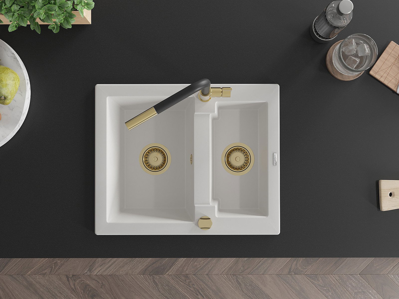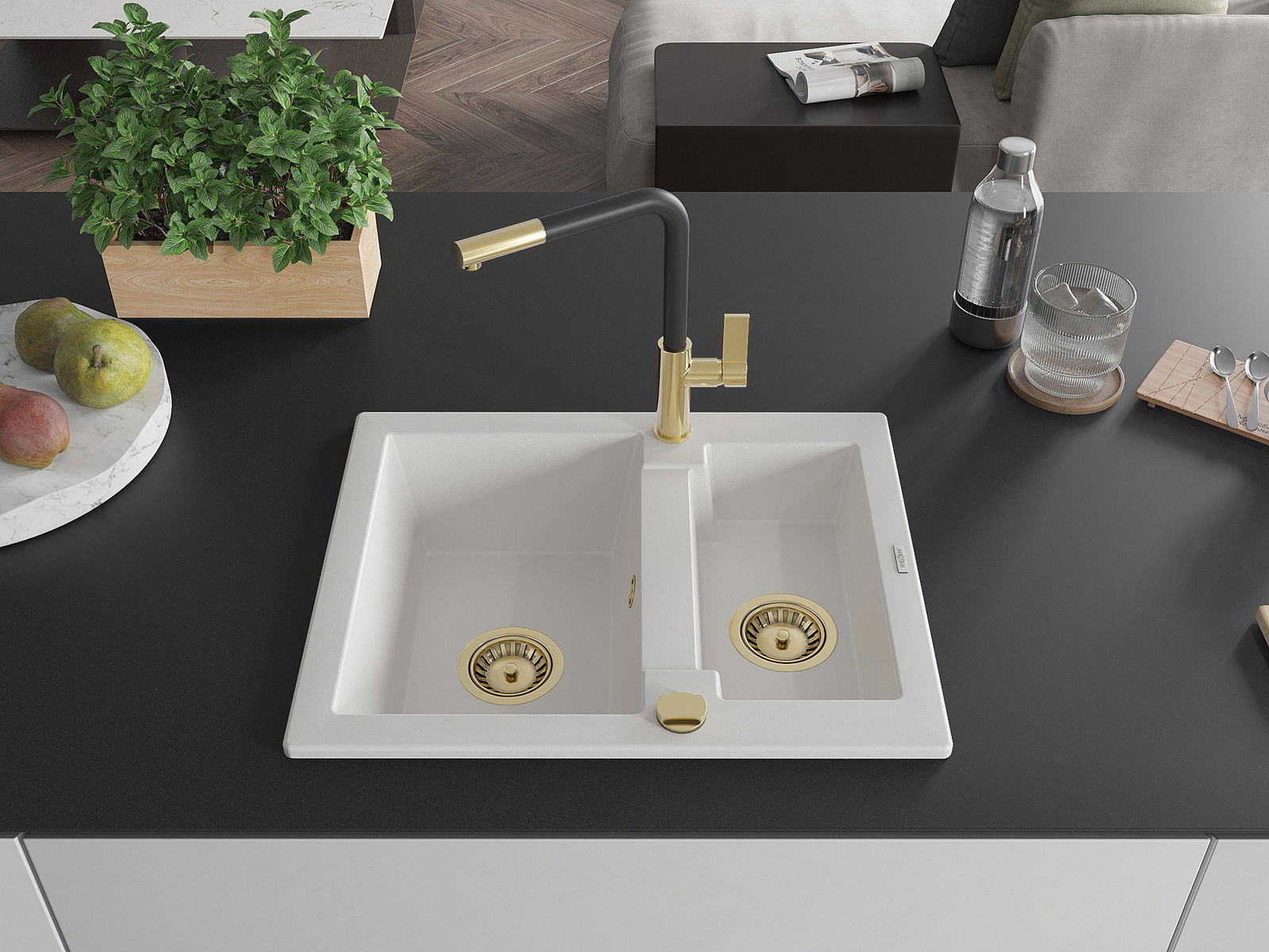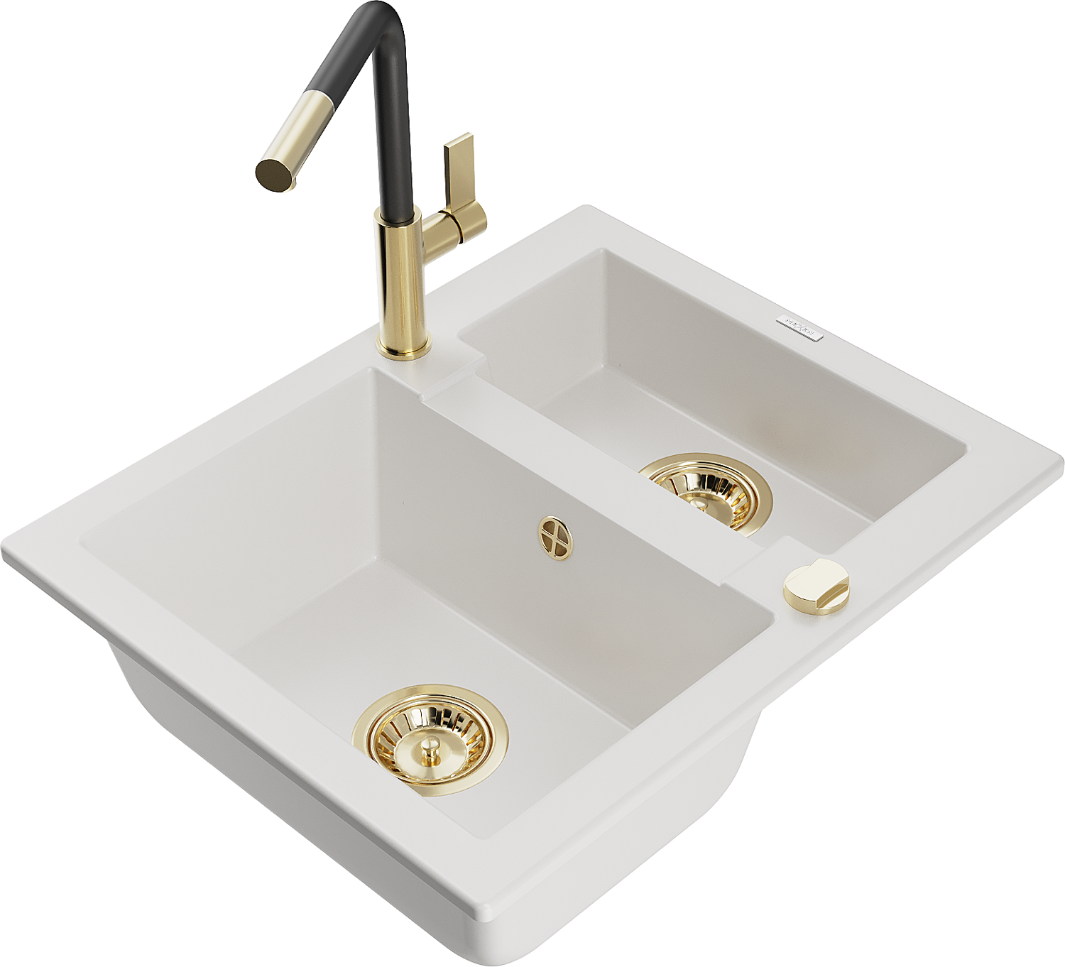 Mexen Carlos гранитна кухненска мивка 1,5-камерна с батерия Flora, бяла