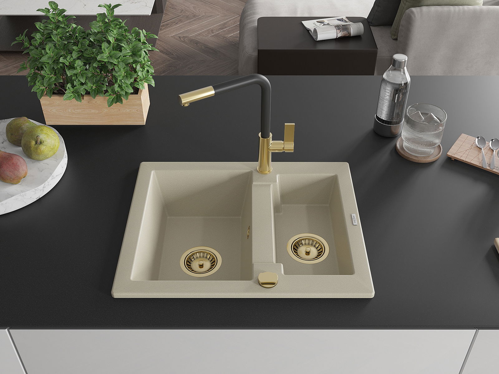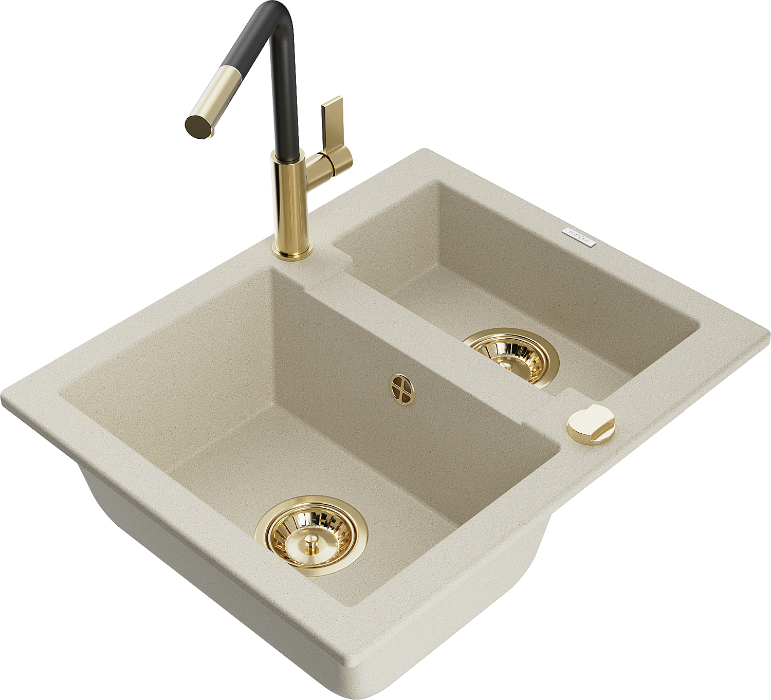 Mexen Carlos кухненска мивка от гранит с 1,5 камери и кухненски смесител Flora, бежов - 6518-69-670401-57-G