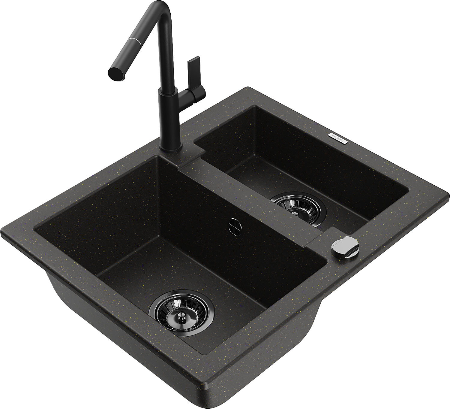 Mexen Carlos гранитна мивка 1,5 камери с кухненски смесител Flora, черен/златист металик - 6518-75-670401-70-B