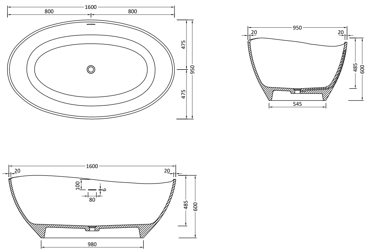 Mexen Parma свободностояща вана от конгломерат 160 x 95 см, черна матова - 57231609570