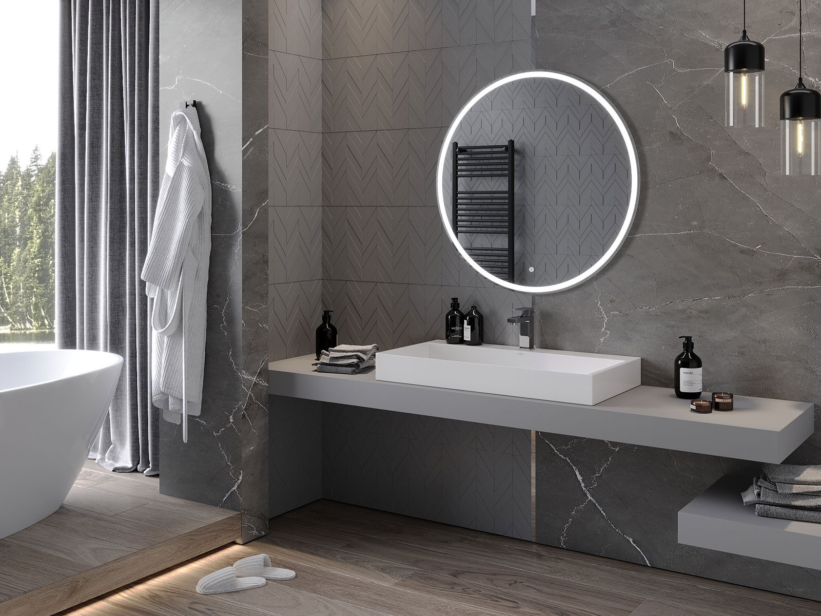LED подсветката на огледалото е практичен елемент, който улеснява ежедневната грижа, благодарение на възможността за идеално осветление на лицето. Подсветката придава на банята модерен завършек, подчертавайки елегантния му декор.