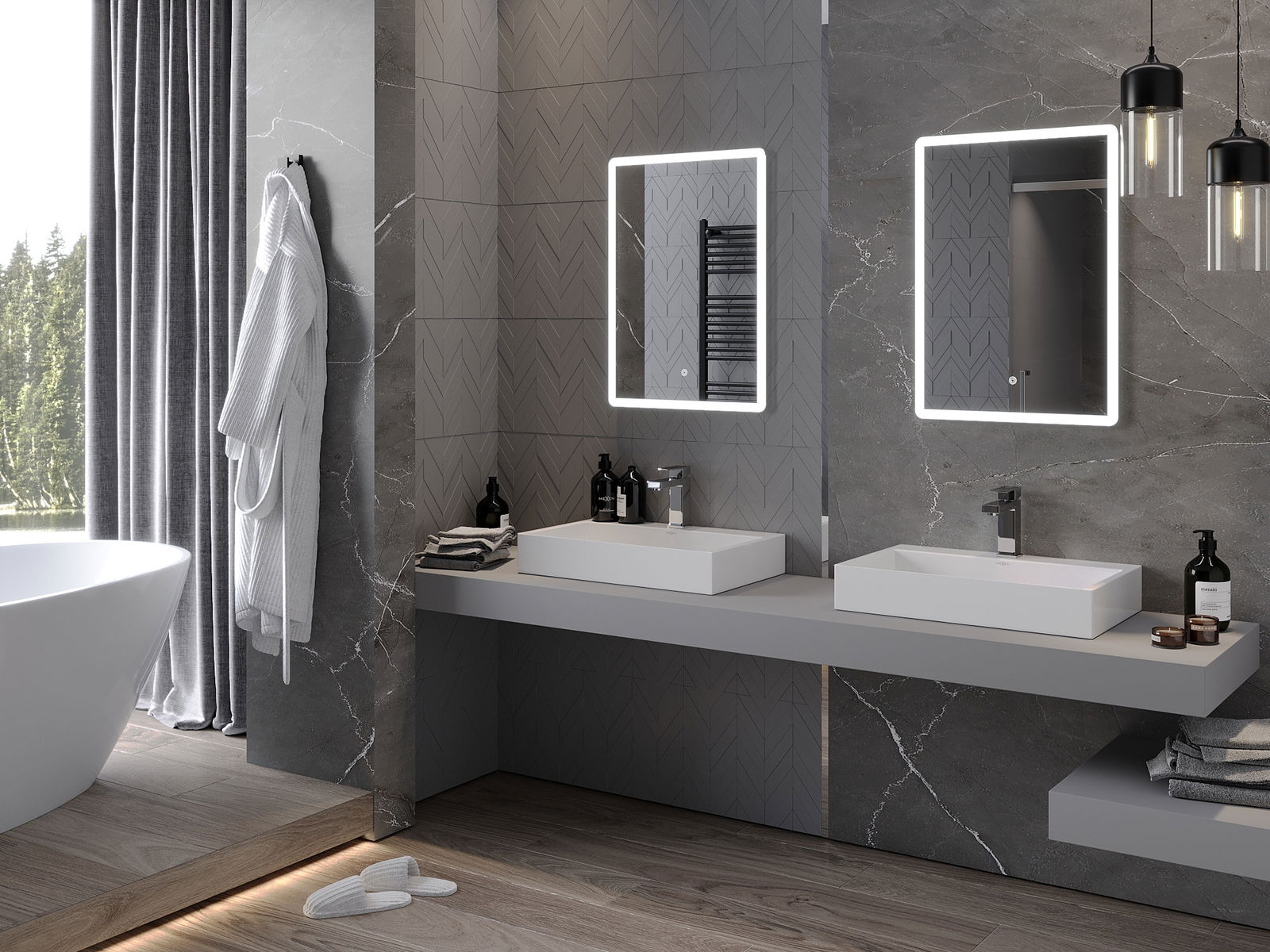 LED подсветката на огледалото е практичен елемент, който улеснява ежедневната грижа, благодарение на възможността за идеално осветление на лицето. Подсветката придава на банята модерен завършек, подчертавайки елегантния му декор.