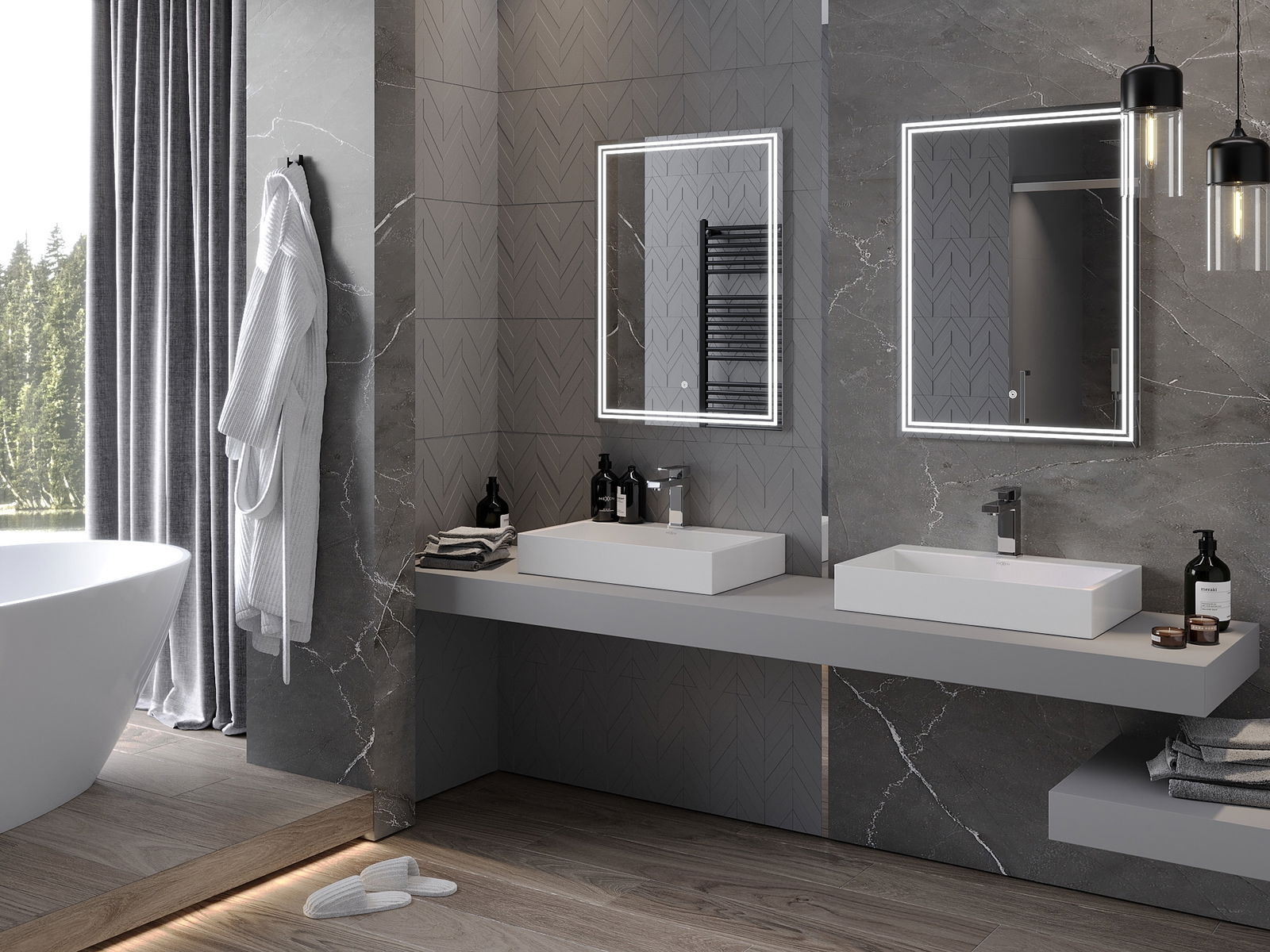 LED подсветката на огледалото е практичен елемент, който улеснява ежедневната грижа, благодарение на възможността за идеално осветление на лицето. Подсветката придава на банята модерен завършек, подчертавайки елегантния му декор.