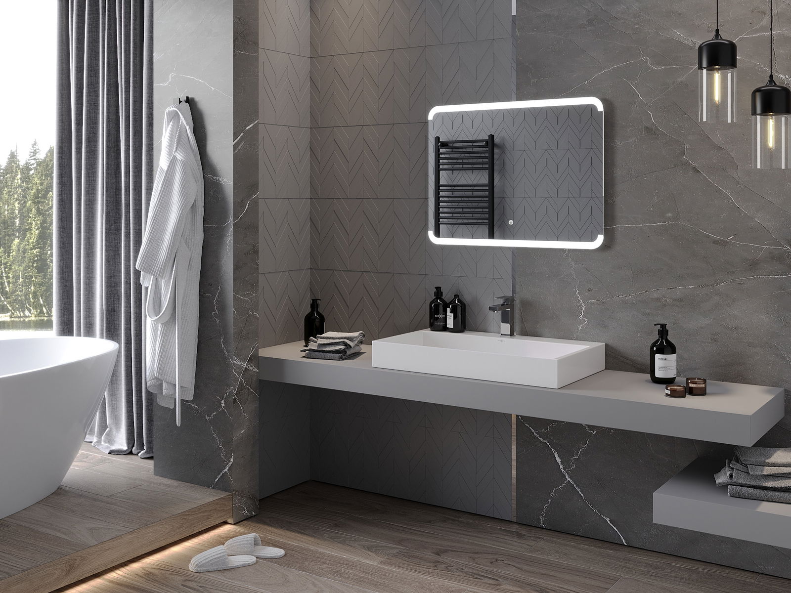 LED подсветката на огледалото е практичен елемент, който улеснява ежедневната грижа, благодарение на възможността за идеално осветление на лицето. Подсветката придава на банята модерен завършек, подчертавайки елегантния му декор.