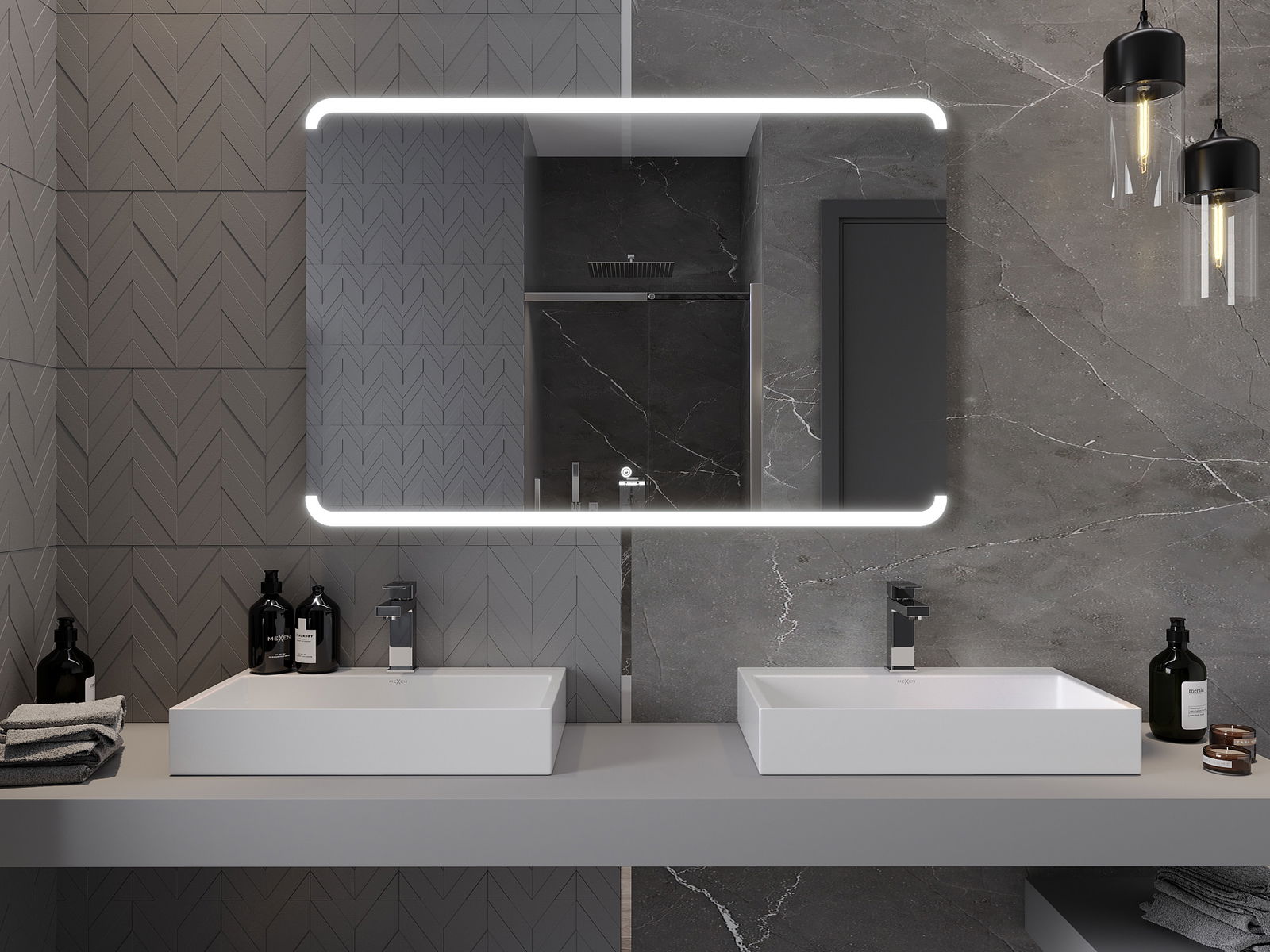 LED подсветката на огледалото е практичен елемент, който улеснява ежедневната грижа, благодарение на възможността за идеално осветление на лицето. Подсветката придава на банята модерен завършек, подчертавайки елегантния му декор.
