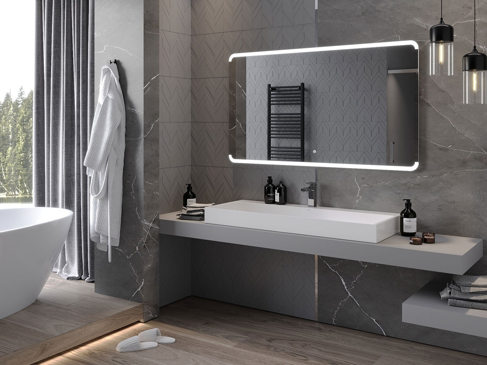 LED осветлението около огледалото е практичен елемент, който улеснява ежедневната грижа със способността за идеално осветяване на лицето. Осветлението придава на банята модерно излъчване, подчертавайки нейния елегантен интериор.