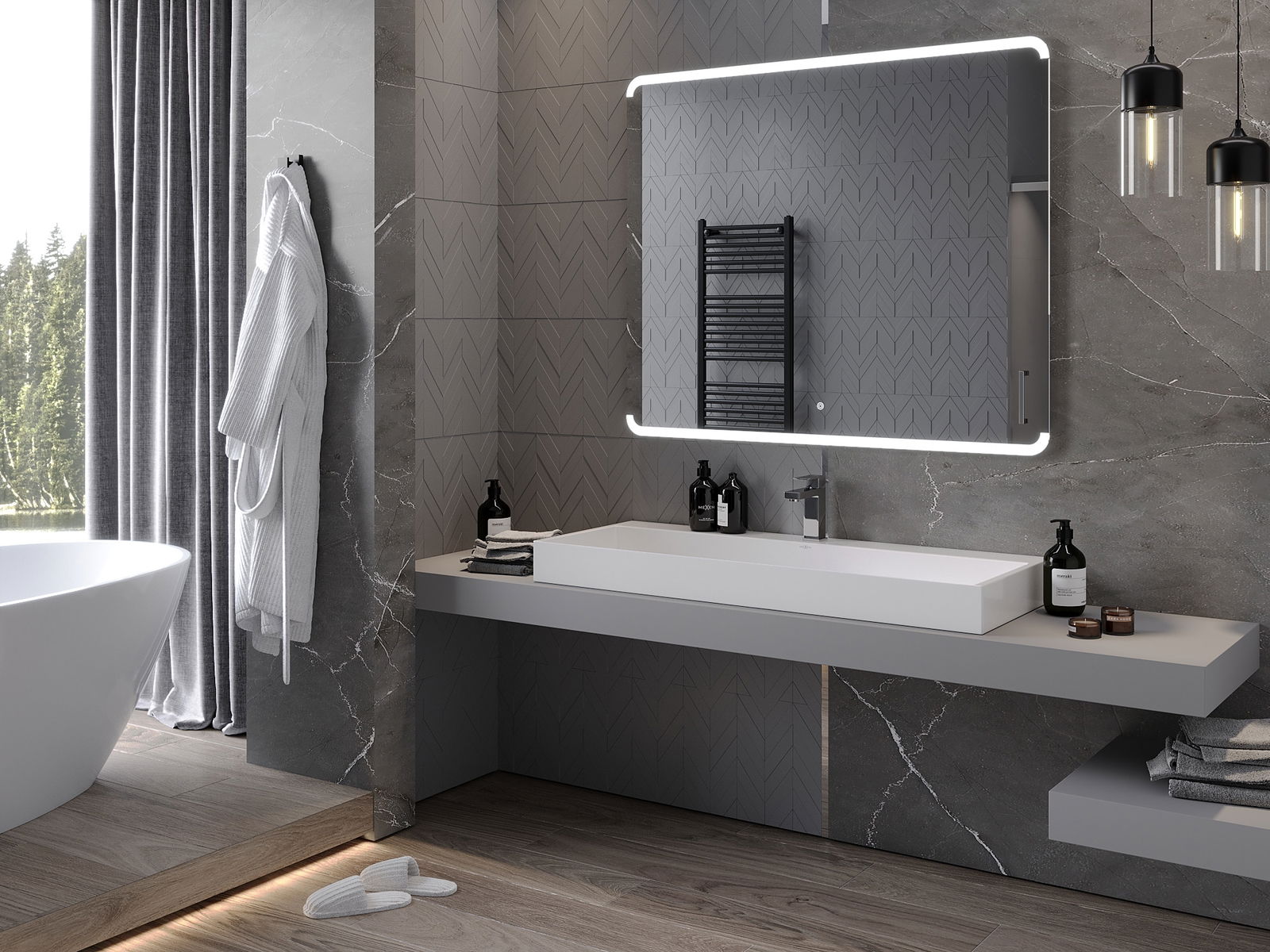 LED подсветката на огледалото е практичен елемент, който улеснява ежедневната грижа, благодарение на възможността за идеално осветление на лицето. Подсветката придава на банята модерен завършек, подчертавайки елегантния му декор.