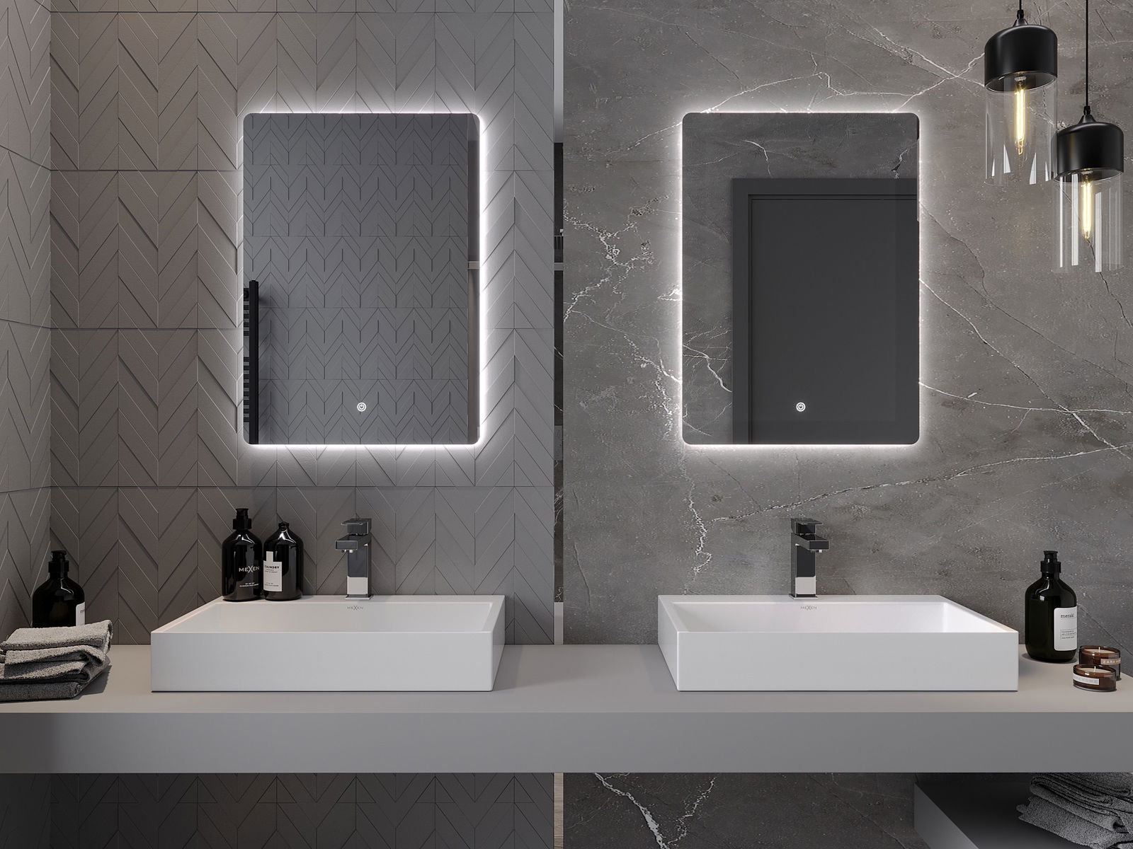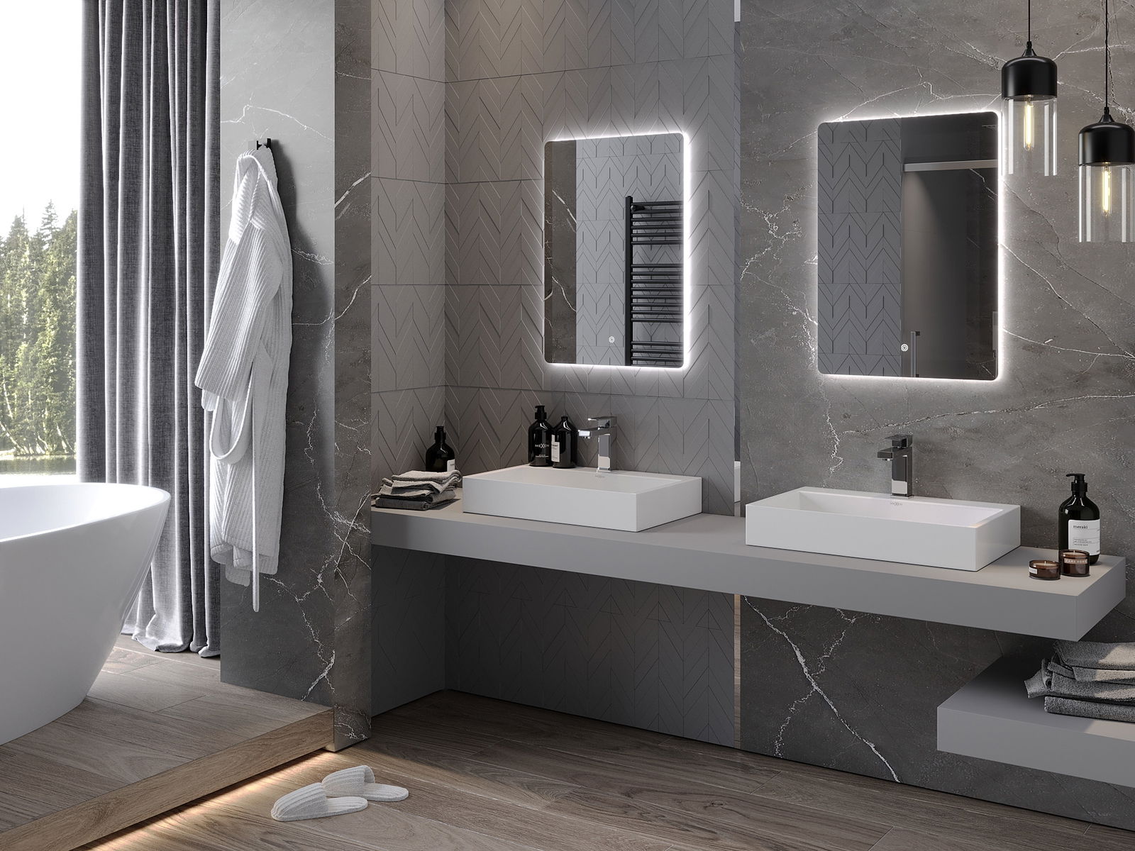 LED подсветката на огледалото е практичен елемент, който улеснява ежедневната грижа, благодарение на възможността за идеално осветление на лицето. Подсветката придава на банята модерен завършек, подчертавайки елегантния му декор.