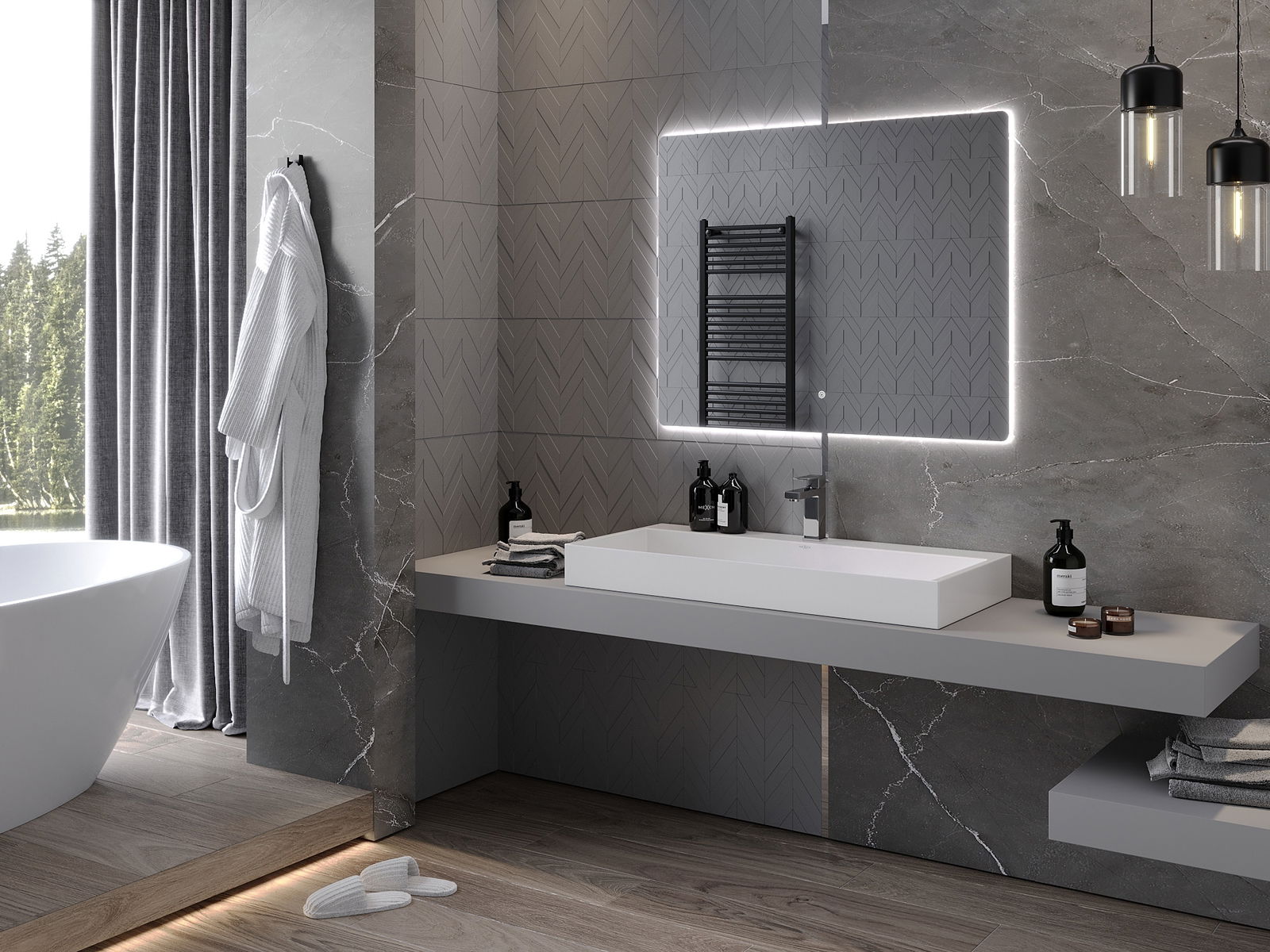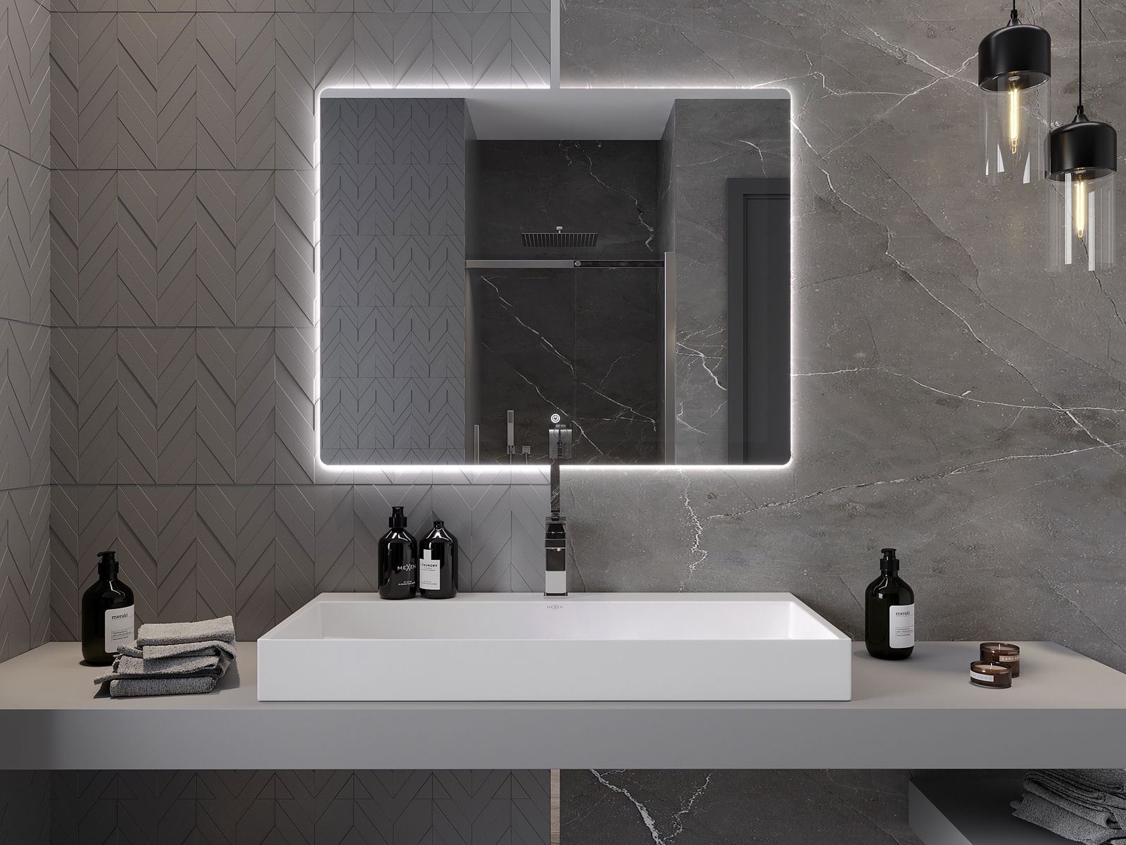 LED подсветката на огледалото е практичен елемент, който улеснява ежедневната грижа, благодарение на възможността за идеално осветление на лицето. Подсветката придава на банята модерен завършек, подчертавайки елегантния му декор.