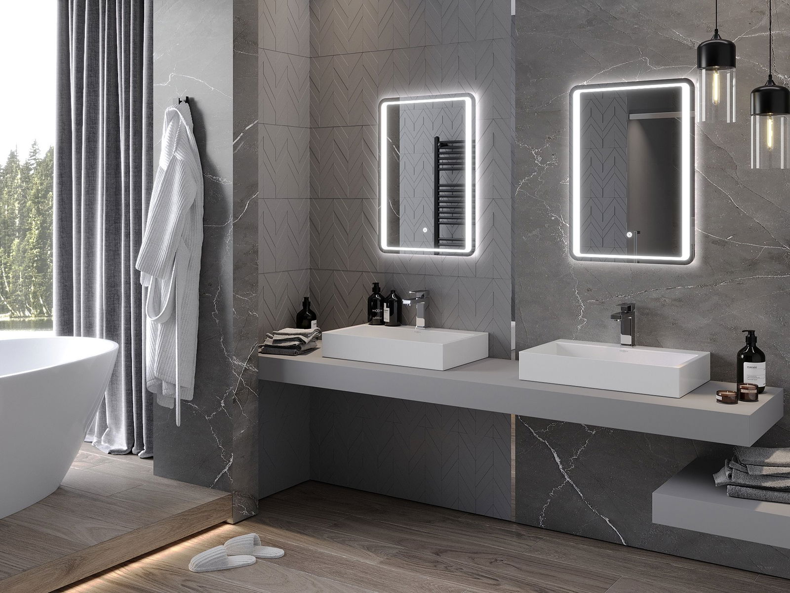 LED осветлението около огледалото е практичен елемент, който улеснява ежедневната грижа със способността за идеално осветяване на лицето. Осветлението придава на банята модерно излъчване, подчертавайки нейния елегантен интериор.