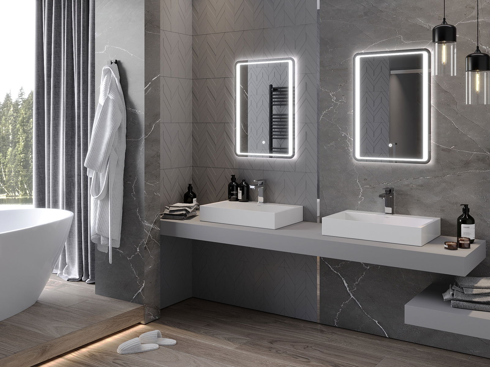LED подсветката на огледалото е практичен елемент, който улеснява ежедневната грижа, благодарение на възможността за идеално осветление на лицето. Подсветката придава на банята модерен завършек, подчертавайки елегантния му декор.