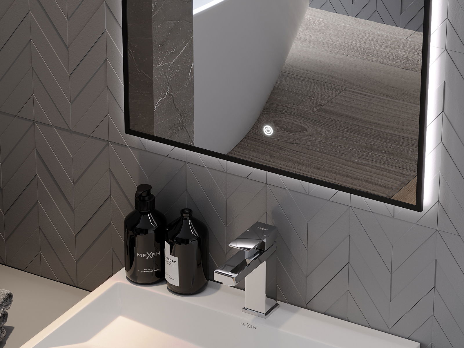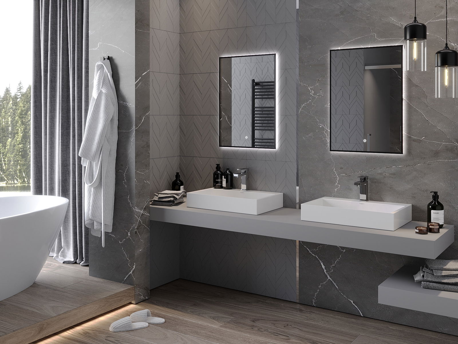 LED подсветката на огледалото е практичен елемент, който улеснява ежедневната грижа, благодарение на възможността за идеално осветление на лицето. Подсветката придава на банята модерен завършек, подчертавайки елегантния му декор.