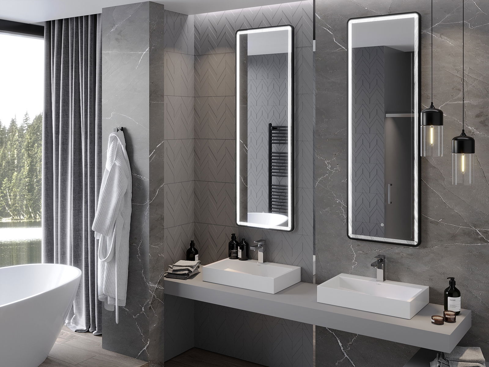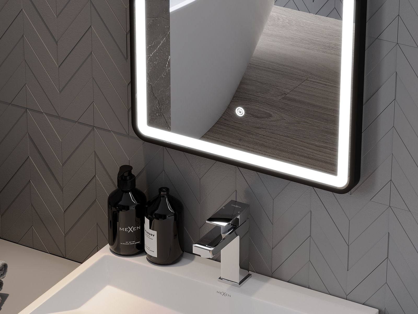 LED подсветката на огледалото е практичен елемент, който улеснява ежедневната грижа, благодарение на възможността за идеално осветление на лицето. Подсветката придава на банята модерен завършек, подчертавайки елегантния му декор.