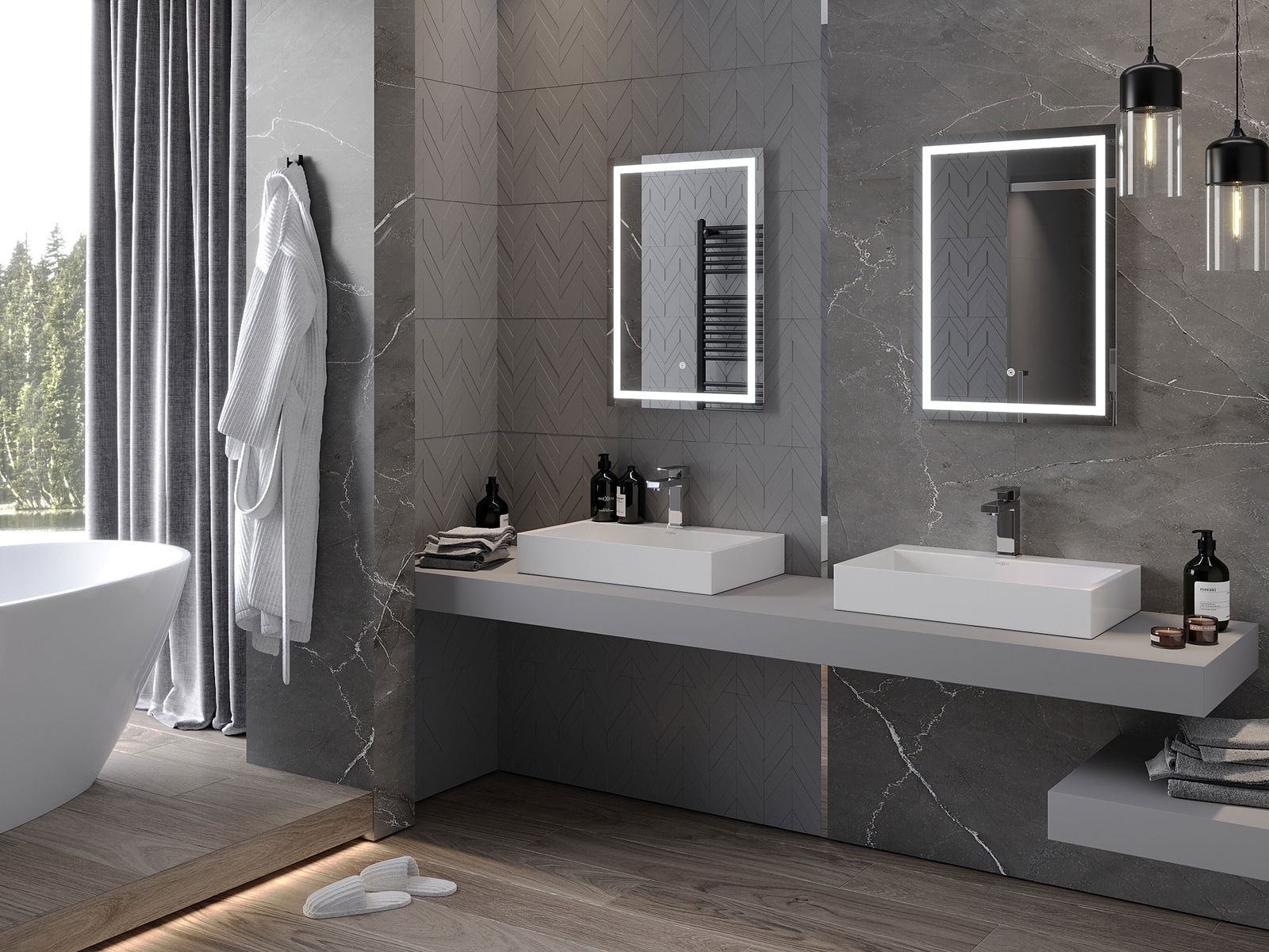 LED подсветката на огледалото е практичен елемент, който улеснява ежедневната грижа, благодарение на възможността за идеално осветление на лицето. Подсветката придава на банята модерен завършек, подчертавайки елегантния му декор.