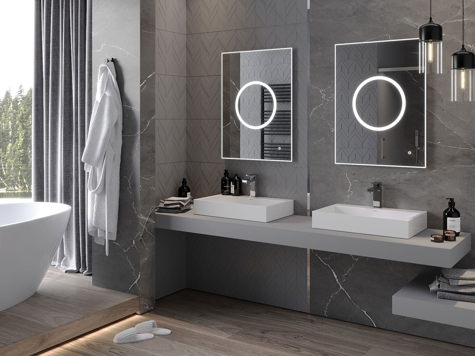 LED подсветката на огледалото е практичен елемент, който улеснява ежедневната грижа, благодарение на възможността за идеално осветление на лицето. Подсветката придава на банята модерен завършек, подчертавайки елегантния му декор.
