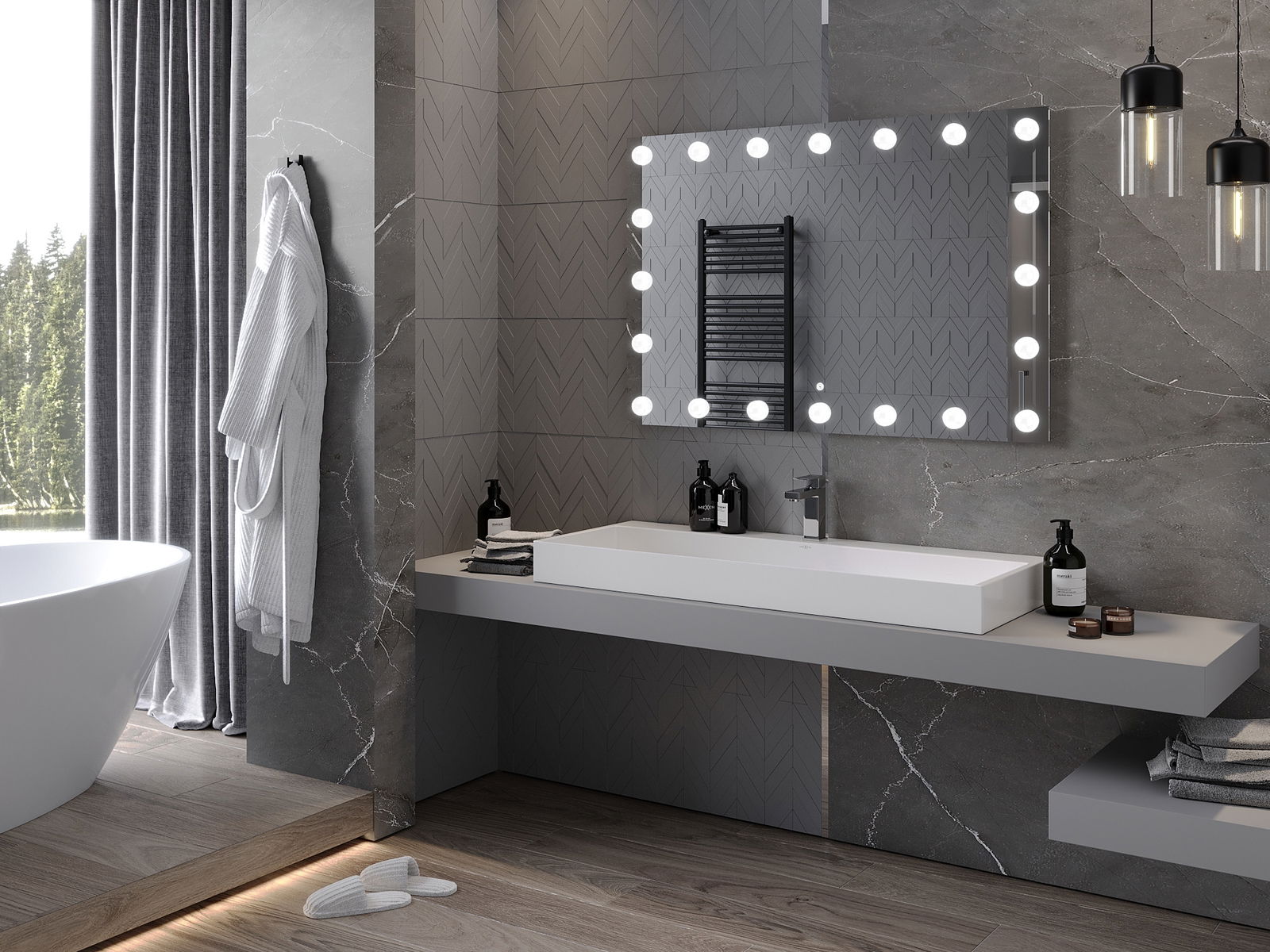 LED подсветката на огледалото е практичен елемент, който улеснява ежедневната грижа, благодарение на възможността за идеално осветление на лицето. Подсветката придава на банята модерен завършек, подчертавайки елегантния му декор.