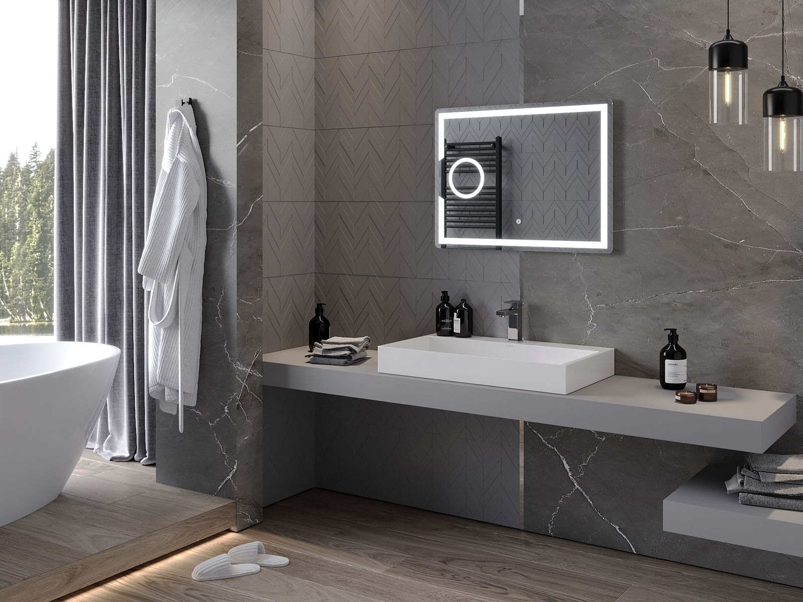 LED подсветката на огледалото е практичен елемент, който улеснява ежедневната грижа, благодарение на възможността за идеално осветление на лицето. Подсветката придава на банята модерен завършек, подчертавайки елегантния му декор.