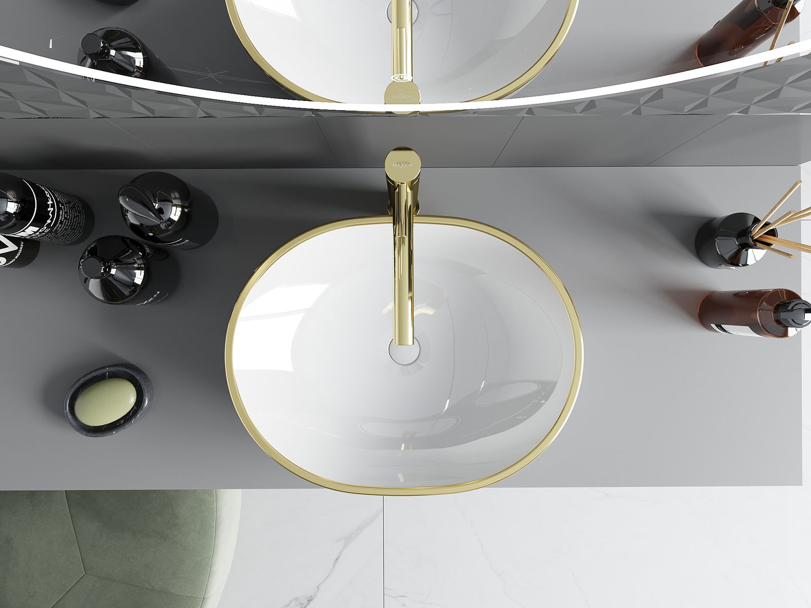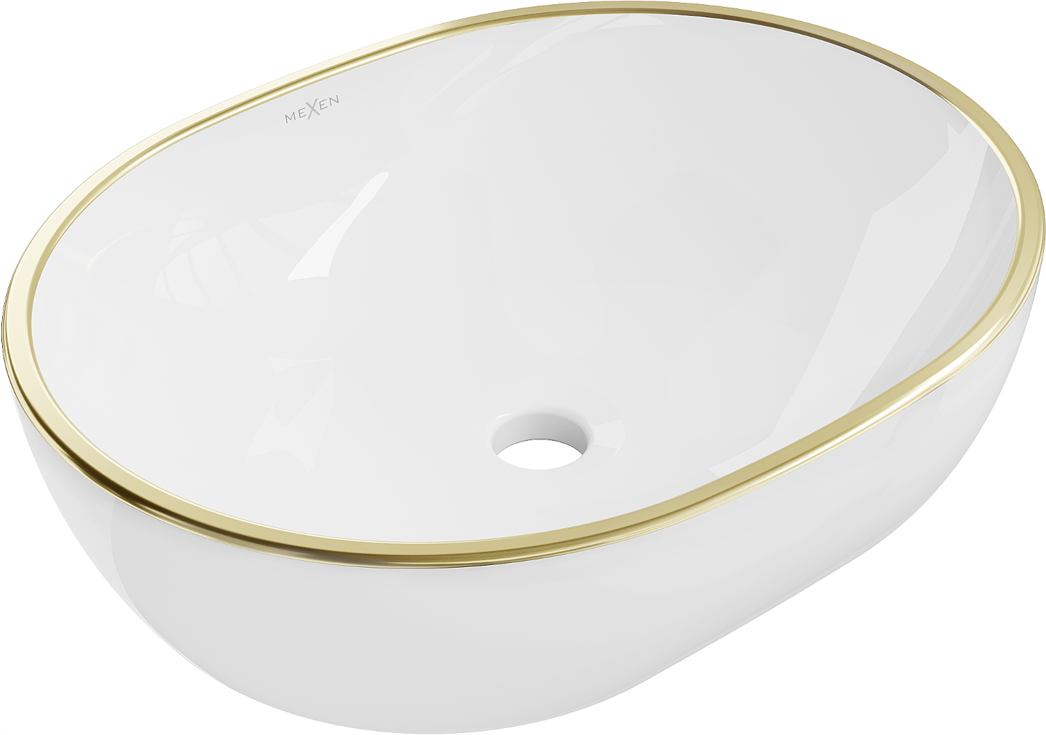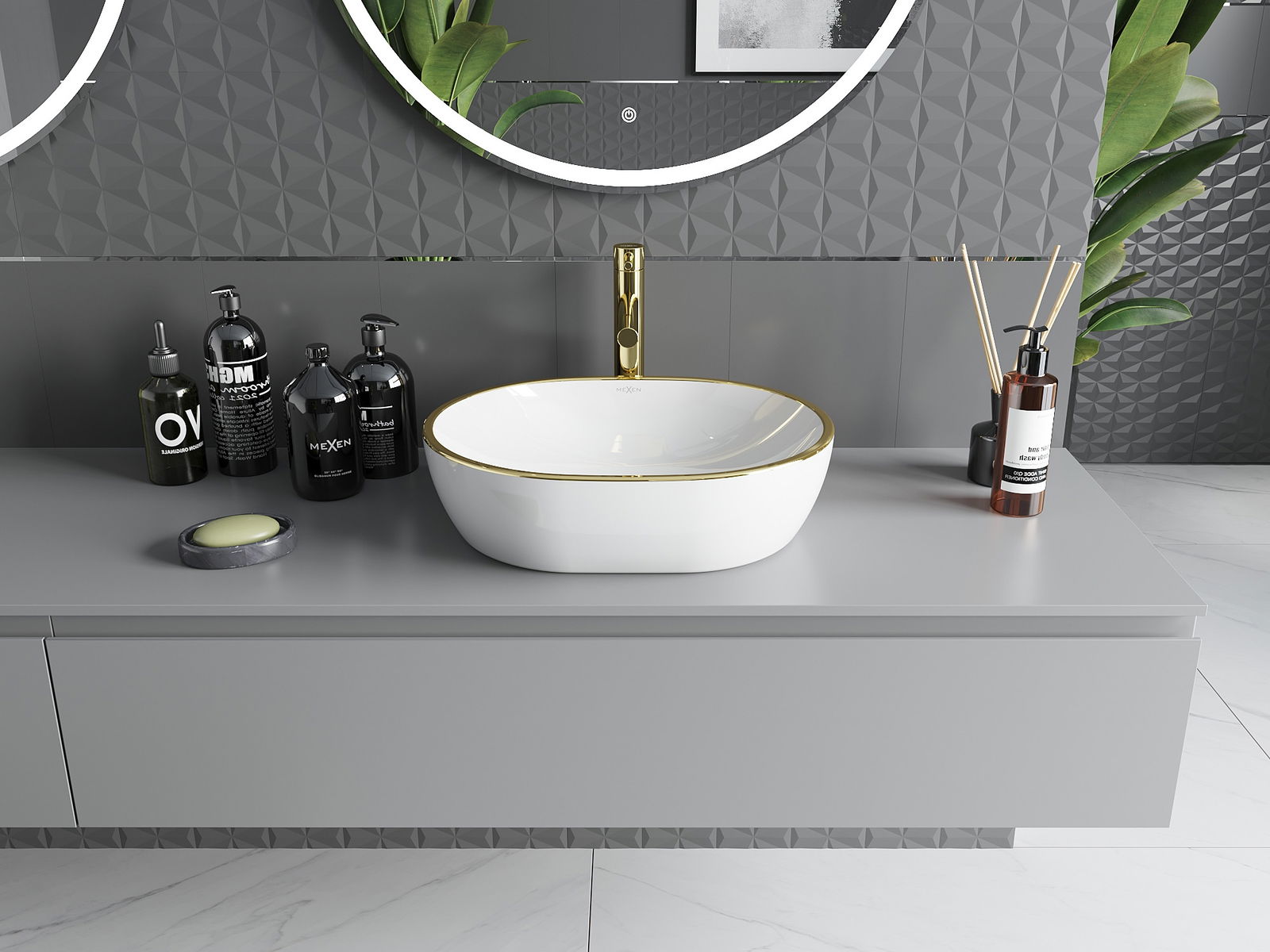 Mexen Viki е елегантна плот вградена мивка с размери 48 x 35 см, идеална за съвременни интериори. Изработена от санитарна керамика, тя се отличава със снежнобяло покритие и златен кант, което й придава луксозен вид. Мивката има дълбочина 11,5 см и не изисква отвори за батерия, което улеснява монтажа й. Благодарение на защитната повърхност с гланц и овалната форма, тя се интегрира перфектно във всяка баня, осигурявайки едновременно функционалност и естетика.