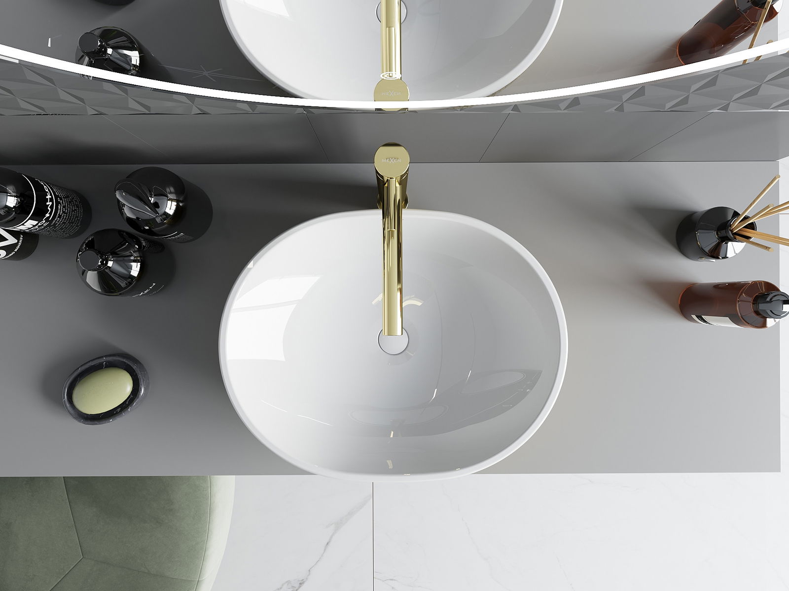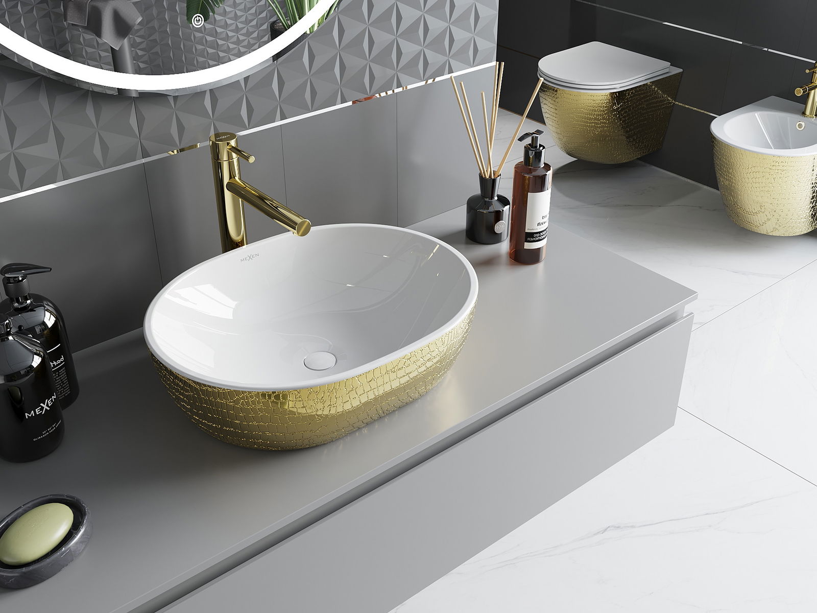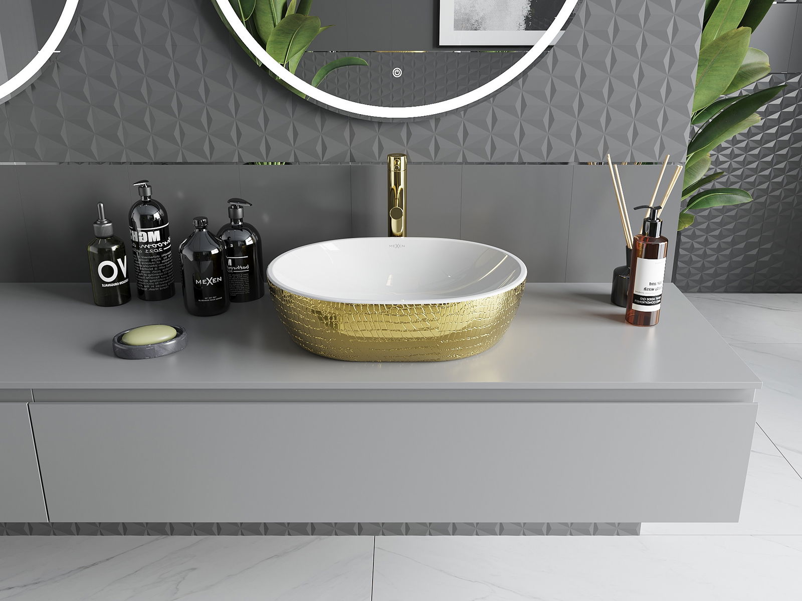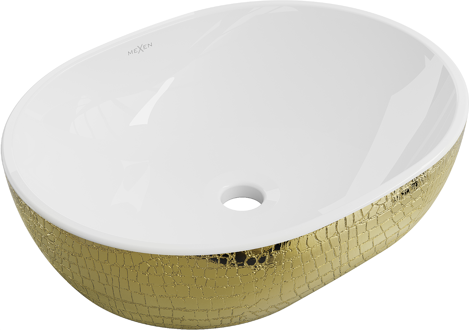Mexen Viki е мивка стояща върху плот с размери 48 x 35 см, която съчетава елегантността на бялото и златното в уникален черупков образец. Изработена от санитарна керамика, тя осигурява издръжливост и лесност за поддържане на чистота. Липсата на преливен отвор и отвор за батерия я правят идеална за съвременни и минималистични интериори. Защитното покритие, блясъкът и овалната форма са допълнителни предимства на тази мивка, която със сигурност ще се превърне в украшение на всяка баня.