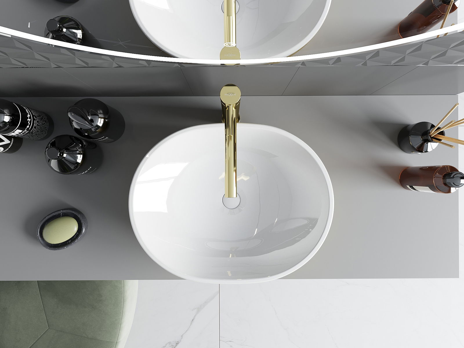 Лъскавата керамика е елегантна и безвременна. Той добавя специален блясък към банята, подчертава естетиката си и въвежда повече елегантност на интериора. Блясъкът отразява светлината, благодарение на която създава впечатление за разширяване и яркост.