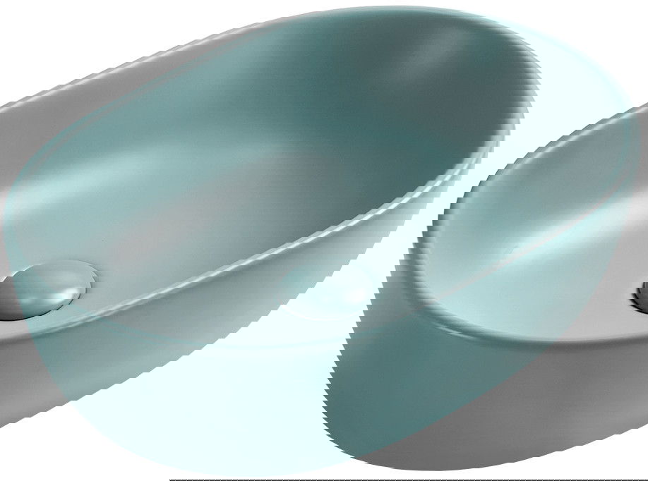 Умивалник върху плот с размери 48 x 35 cm, в цвят светло зелено мат, идеално се вписва в модерни интериори. Изработен от висококачествена санитарна керамика, отличаваща се с защитно покритие, което осигурява трайност и лесно почистване. Липсата на преливен отвор и отвор за батерия го правят отличен избор за дизайнерски бани. Овалната форма и ниската височина от 14 см добавят лека и елегантна визия, което прави умивалника както функционален, така и стилен.