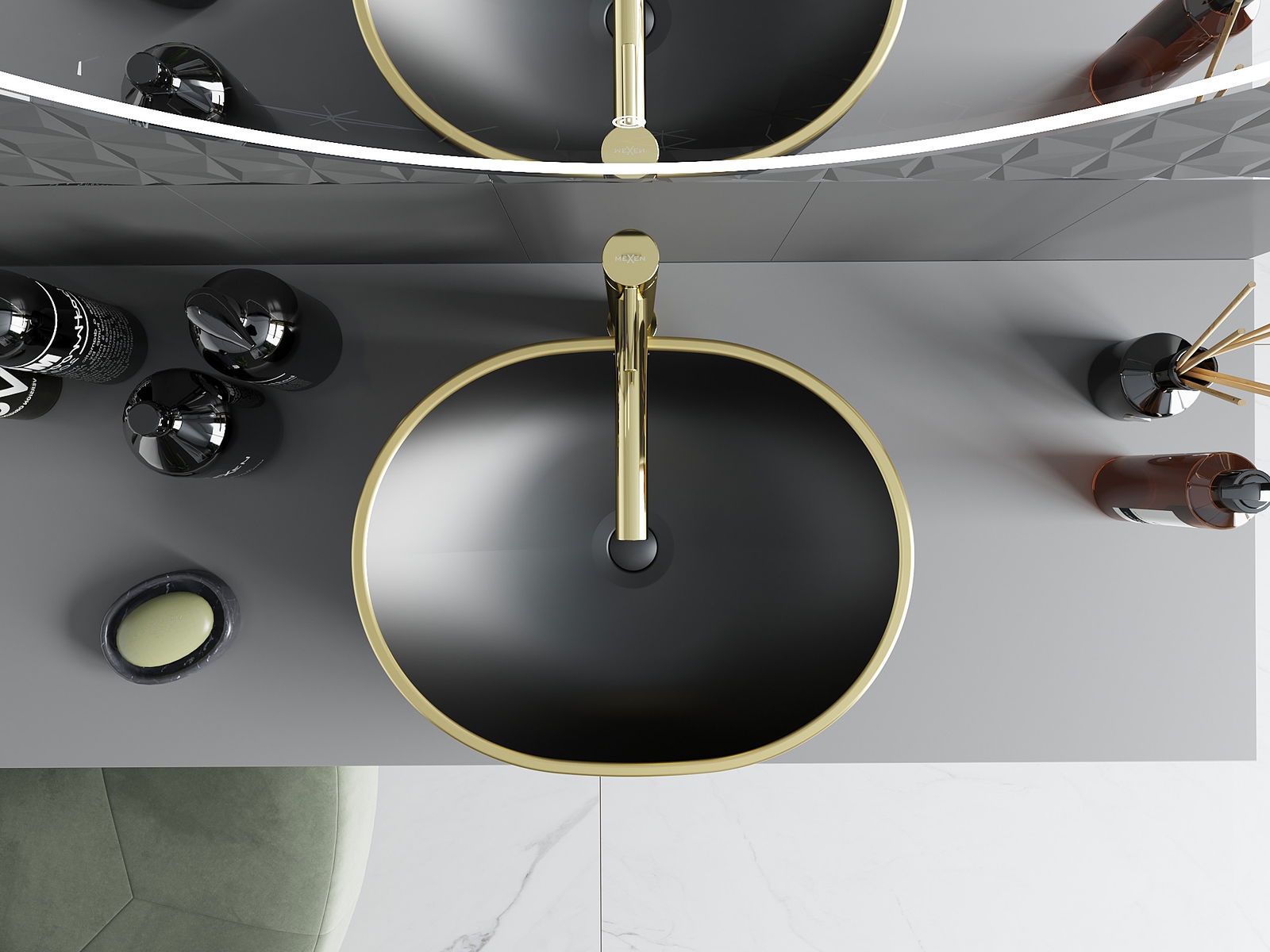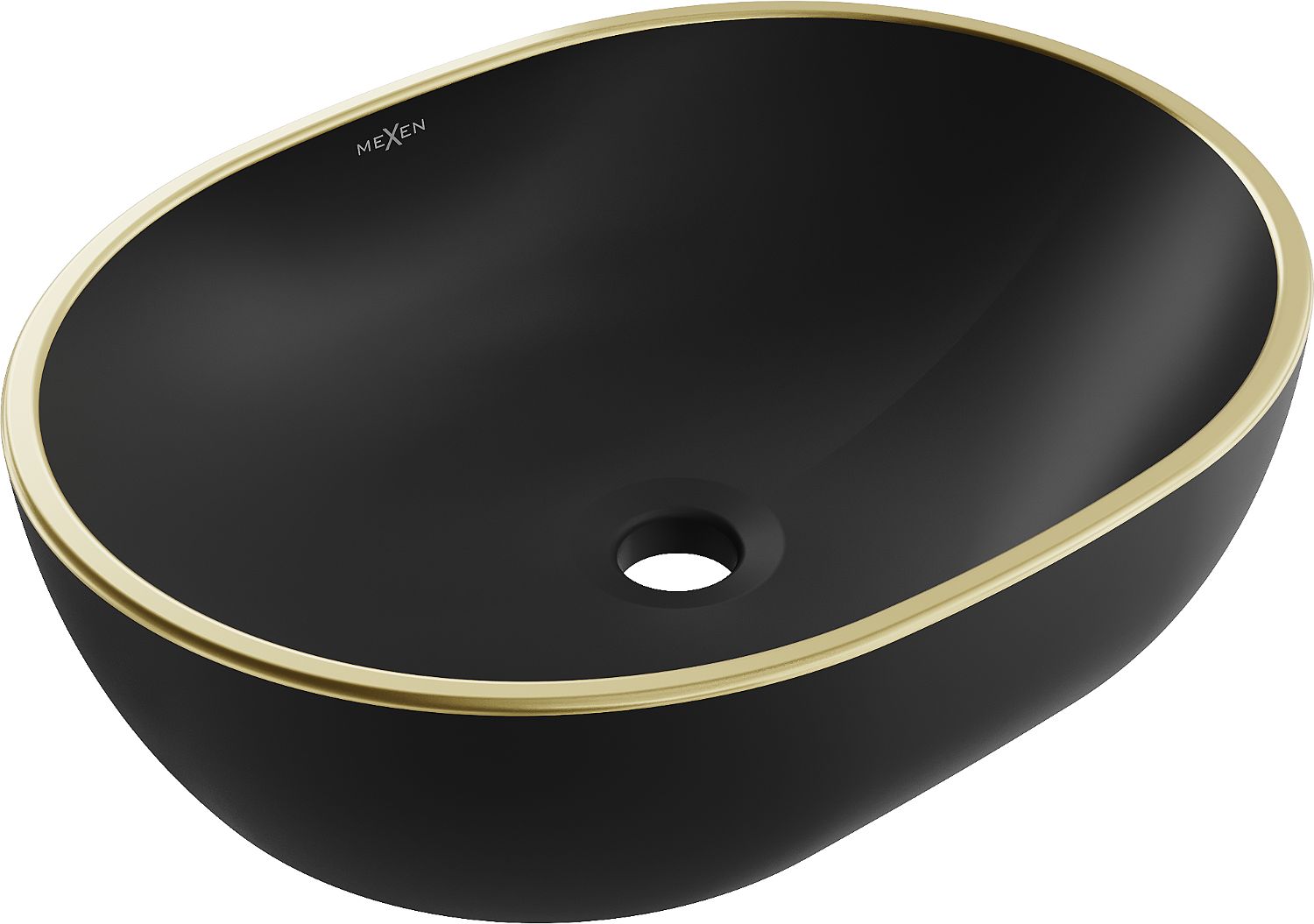 Mexen Viki е елегантна мивка за монтаж върху плот с размери 48,5 x 35 см, достъпна в стилна комбинация от черна мат с златен ръб. Изработена от висококачествена санитарна керамика, тя се характеризира с овална форма и лъскава повърхност, което ѝ придава модерен вид. Липсата на отвори за батерии и прелив създава минималистичен дизайн. Защитното покритие осигурява дълготрайна употреба, а функционалността на мивката я прави отличен избор за всяка баня.