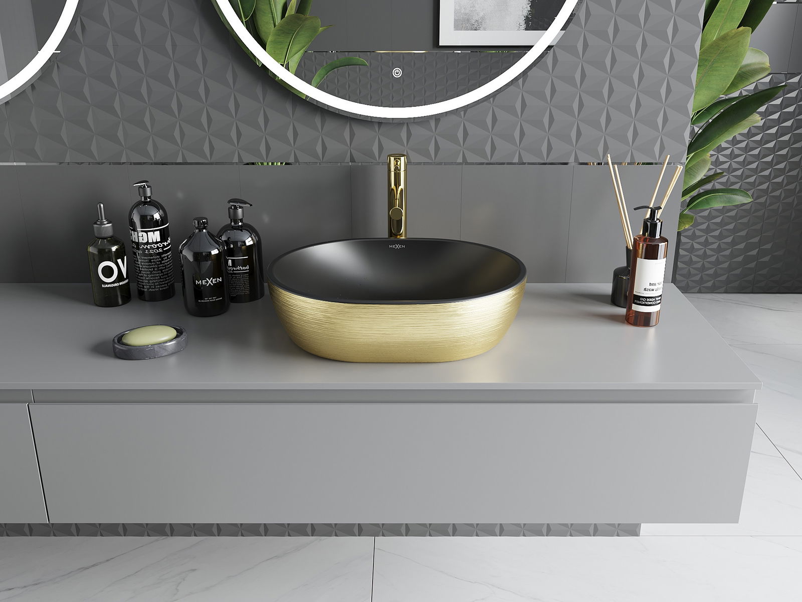 Плотът за мивка е идеално решение за съвременни интериори. С размери 48x35 см и дълбочина 11,5 см, той е перфектен за всяка баня. Неговата елегантна черна матова повърхност със златен линиен модел е комбинация от стил и функционалност. Изработен от висококачествена санитарна керамика, плотът за мивка е не само естетичен, но и издръжлив. Без отвори за батерия и преливник, той се отличава с минималистичен дизайн, който ще подчертае характера на вашето пространство.