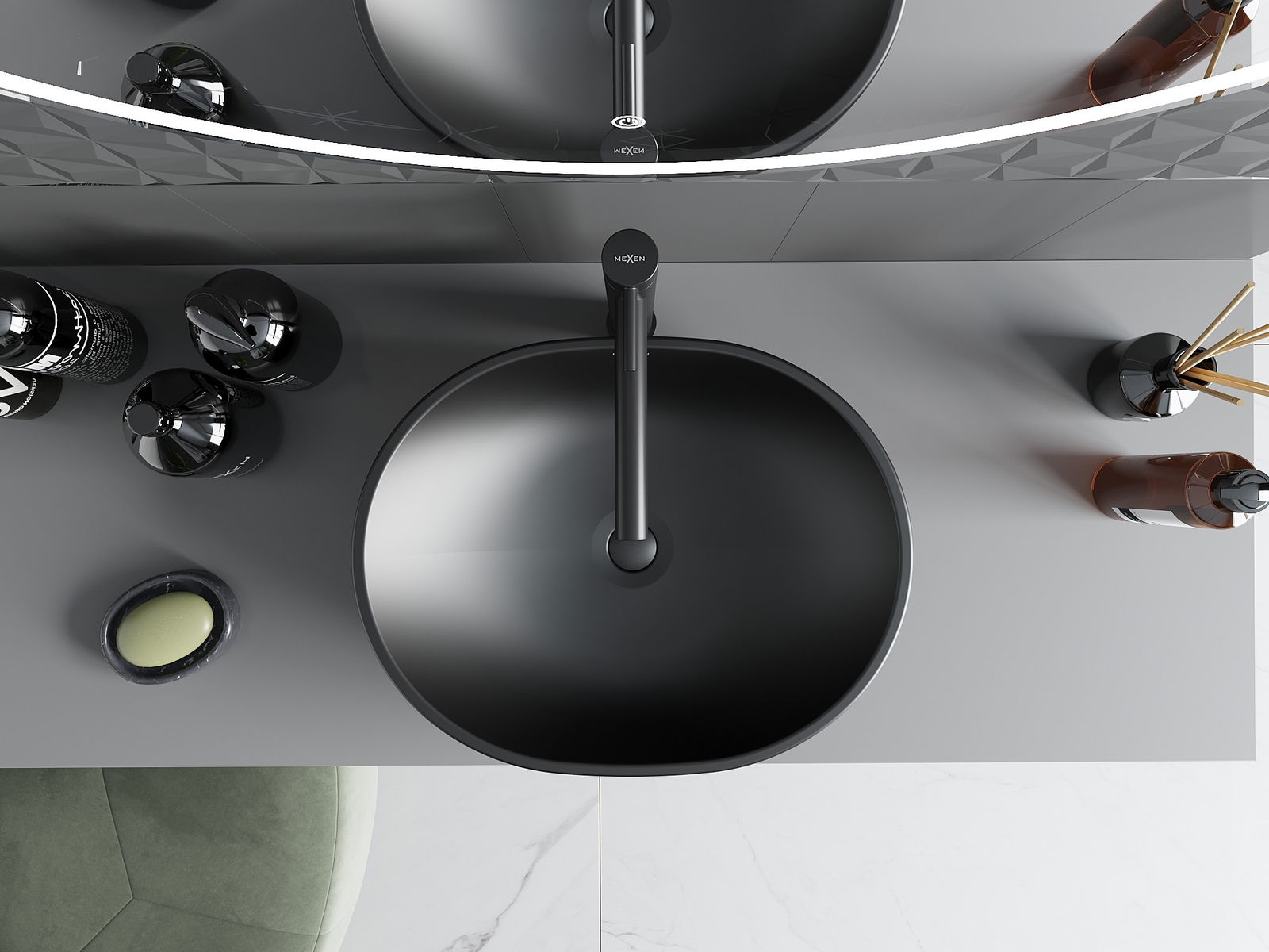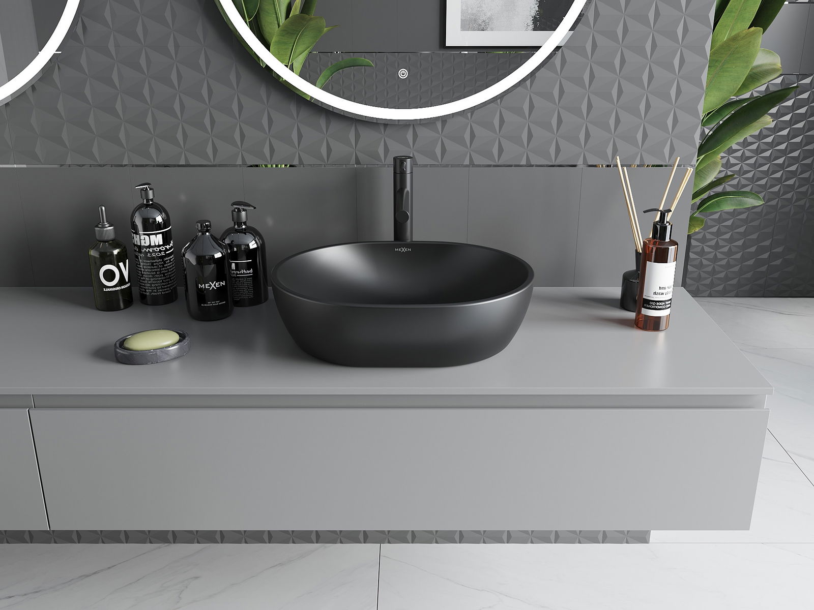 Мивката Mexen Viki е идеално решение за съвременни бани. Мивката за плот с размери 48 x 35 см в елегантен матов черен цвят впечатлява със своя овален дизайн и минималистичен вид. Изработена е от висококачествена санитарна керамика, което осигурява не само естетика, но и устойчивост. Защитното покритие я прави лесна за почистване, а малката ѝ дълбочина от 11,5 см я прави идеална за малки пространства. Липсата на отвори за батерии позволява неограничено аранжиране.