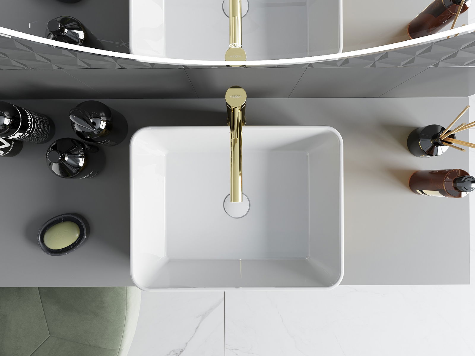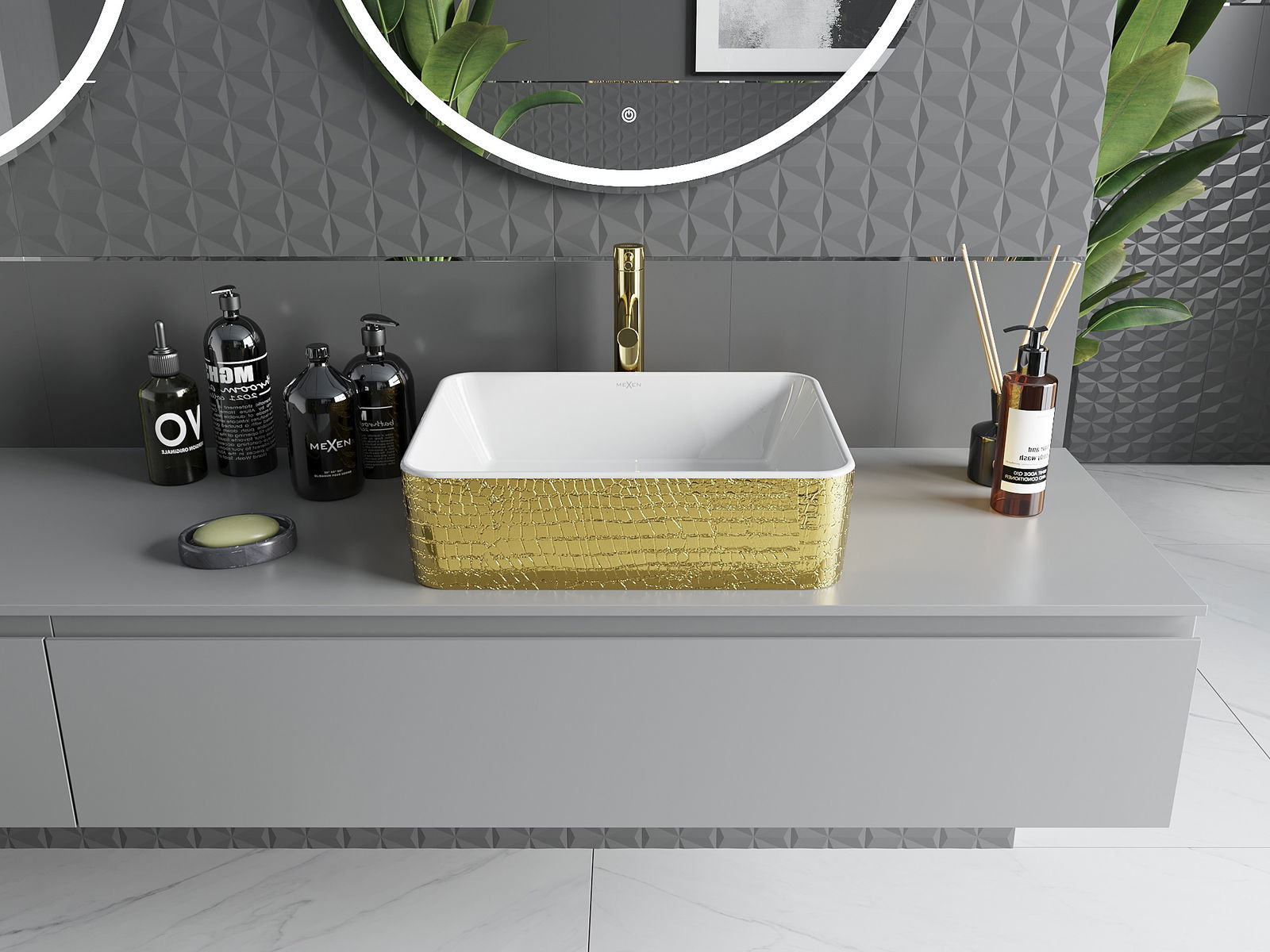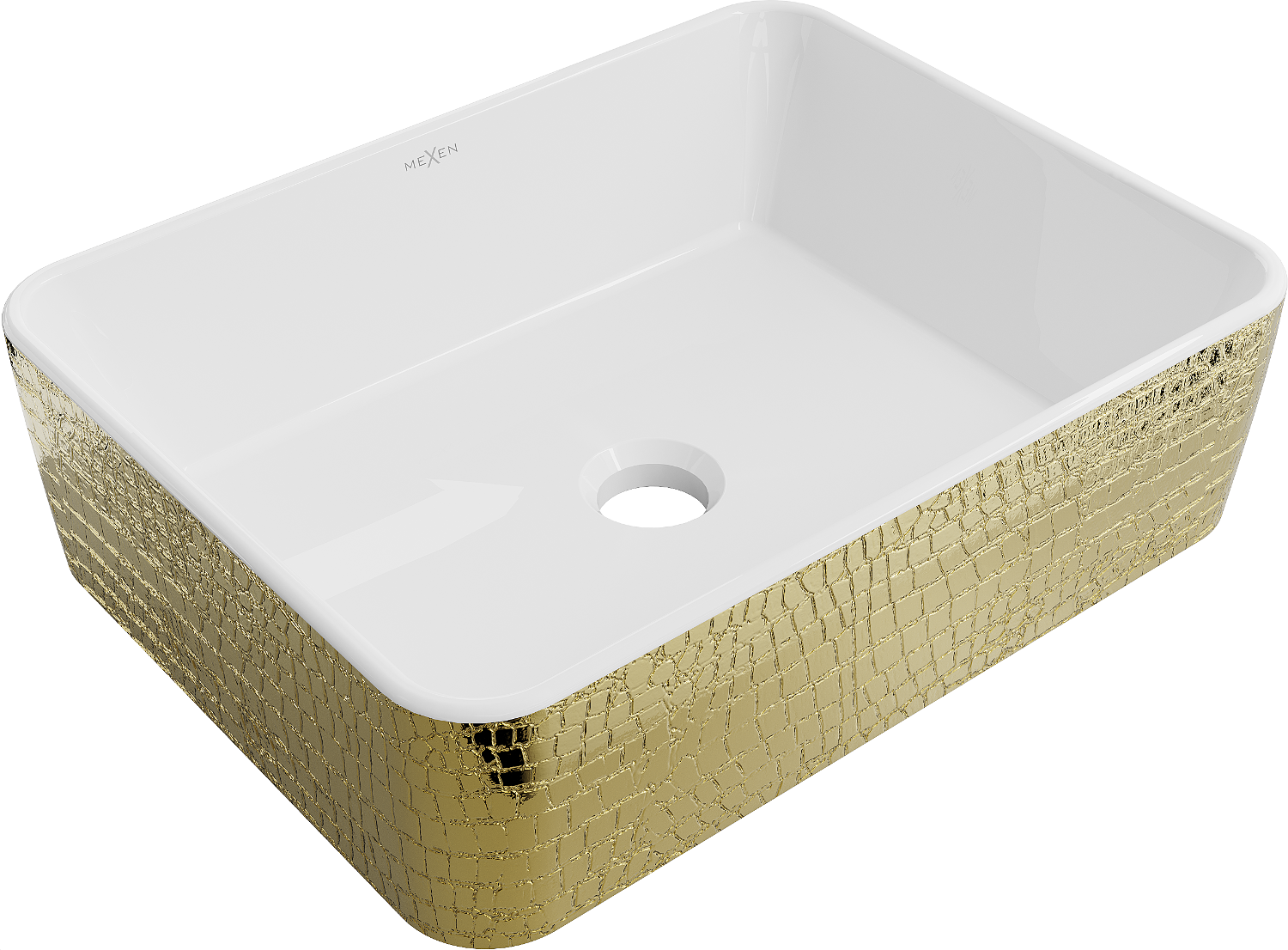 Mexen Catia е елегантна мивка върху плот с размери 48 x 38 см, изработена от санитарна керамика, която съчетава естетика и функционалност. Нейният бяло-златен модел във вид на люспи придава уникален характер на банята, а правоъгълната форма добавя модерен акцент. Благодарение на матовата повърхност и защитното покритие, мивката е лесна за почистване и устойчива на драскотини. Без отвори за батерии и преливане, има елегантен вид, идеален за минималистични интериорни аранжировки.