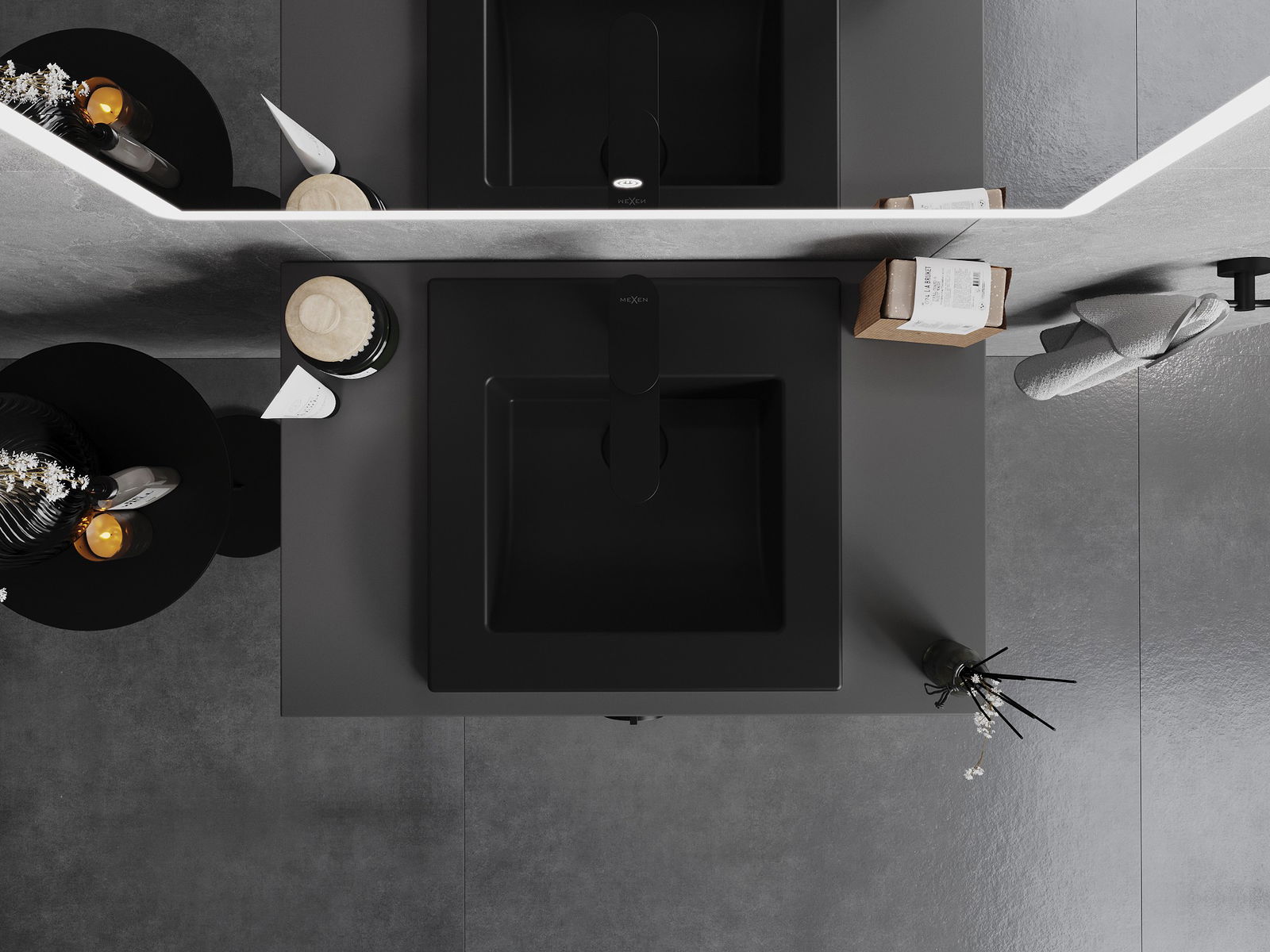 Мивката има дупка, в която можем да монтираме батерията. Това спестява ценно пространство в банята и подчертава естетиката му. Това решение също ви позволява лесно да се държите чисти около мивката.