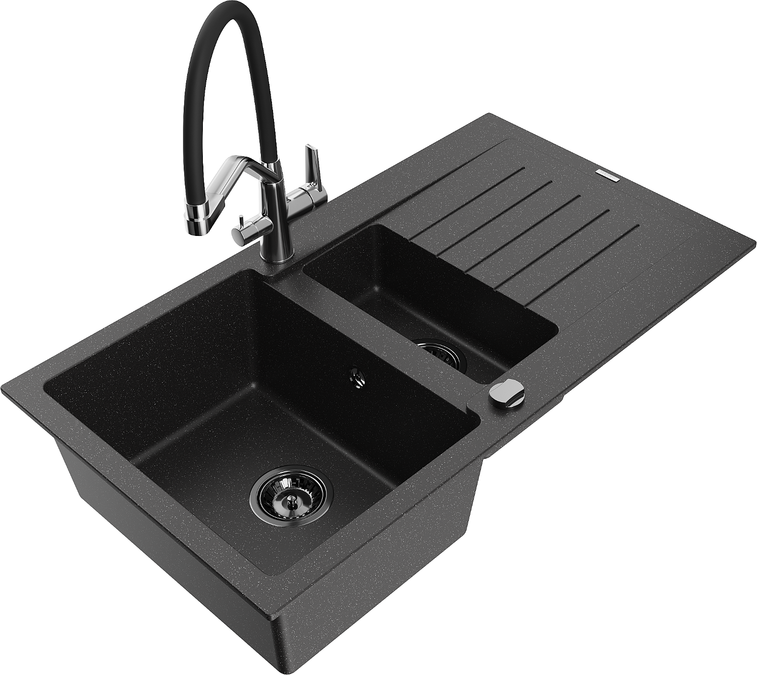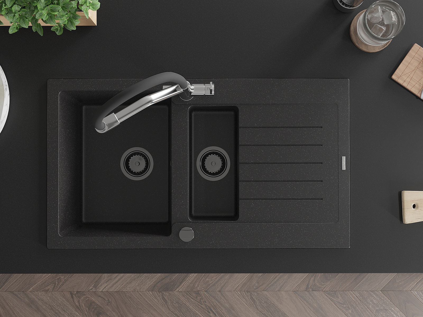 Mexen Matias гранитна мивка 1,5-камерна с отцедник и кухненски смесител Duo, черен/сребърен - 6502-73-671701-07-B