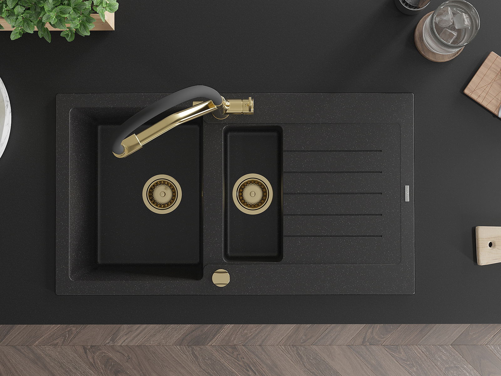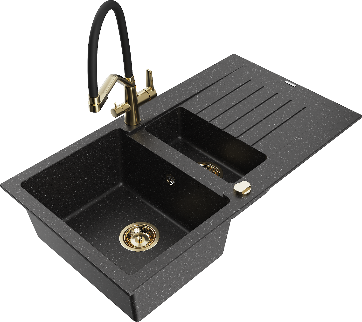 Mexen Matias гранитна мивка с 1,5 отделения с отцедник и кухненски смесител Duo, черно/сребърно - 6502-73-671701-57-G