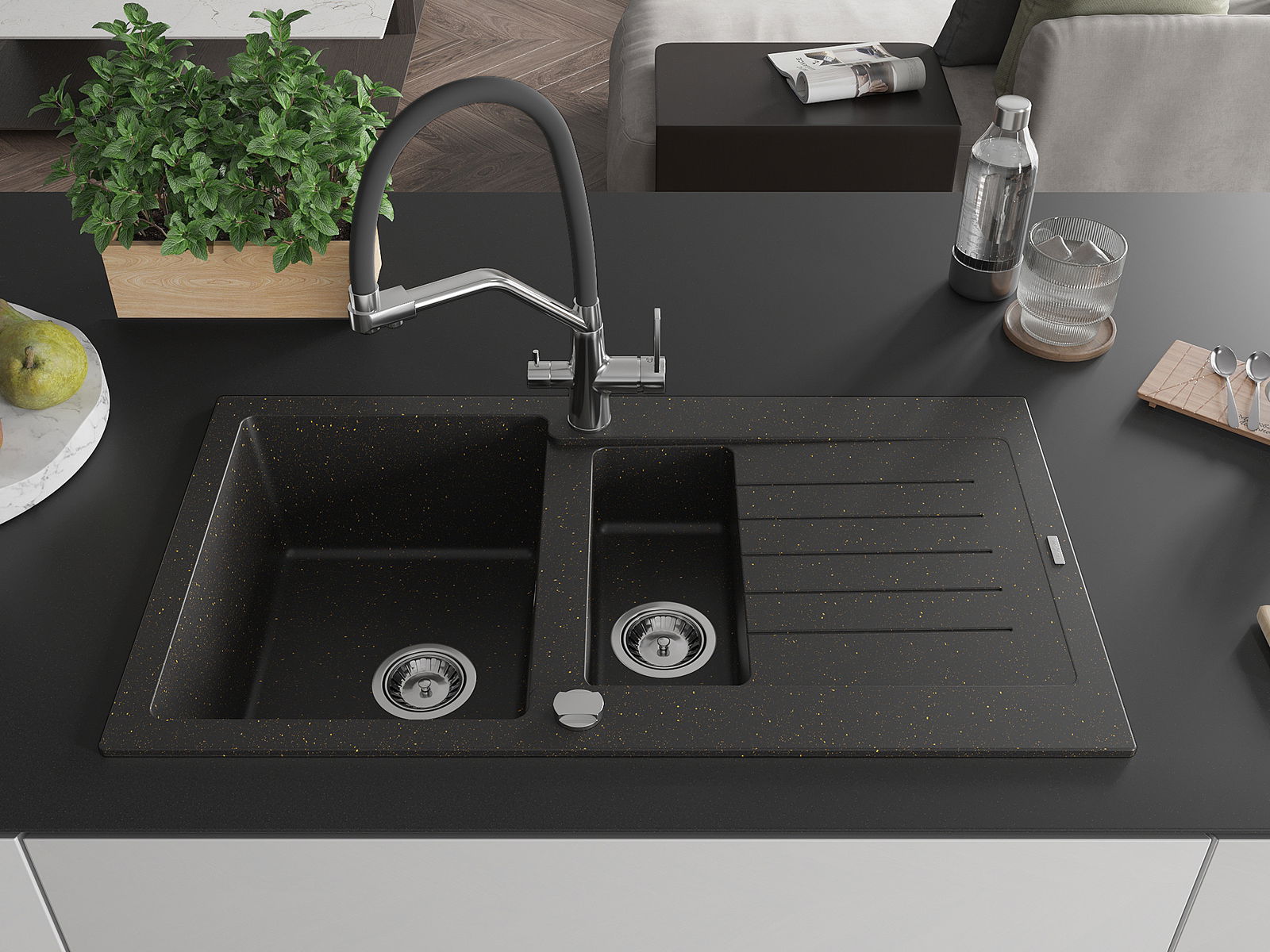 Mexen Matias гранитна мивка с 1,5 камери и отцедник и кухненски смесител Duo, черен/златен металик - 6502-75-671701-07