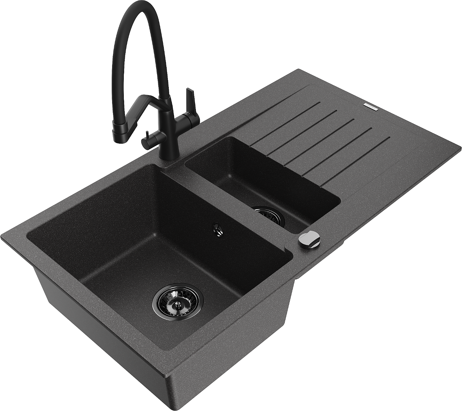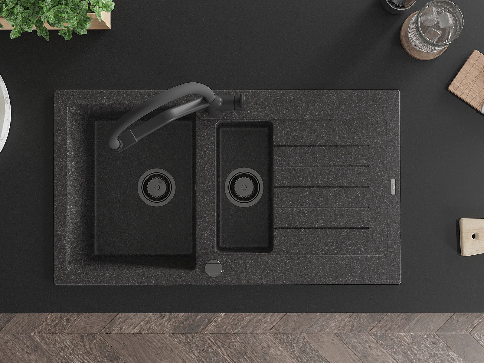 Mexen Matias гранитна мивка 1,5-камерна с изсушител и кухненски смесител Duo, черен на пръски - 6502-76-671701-70-B