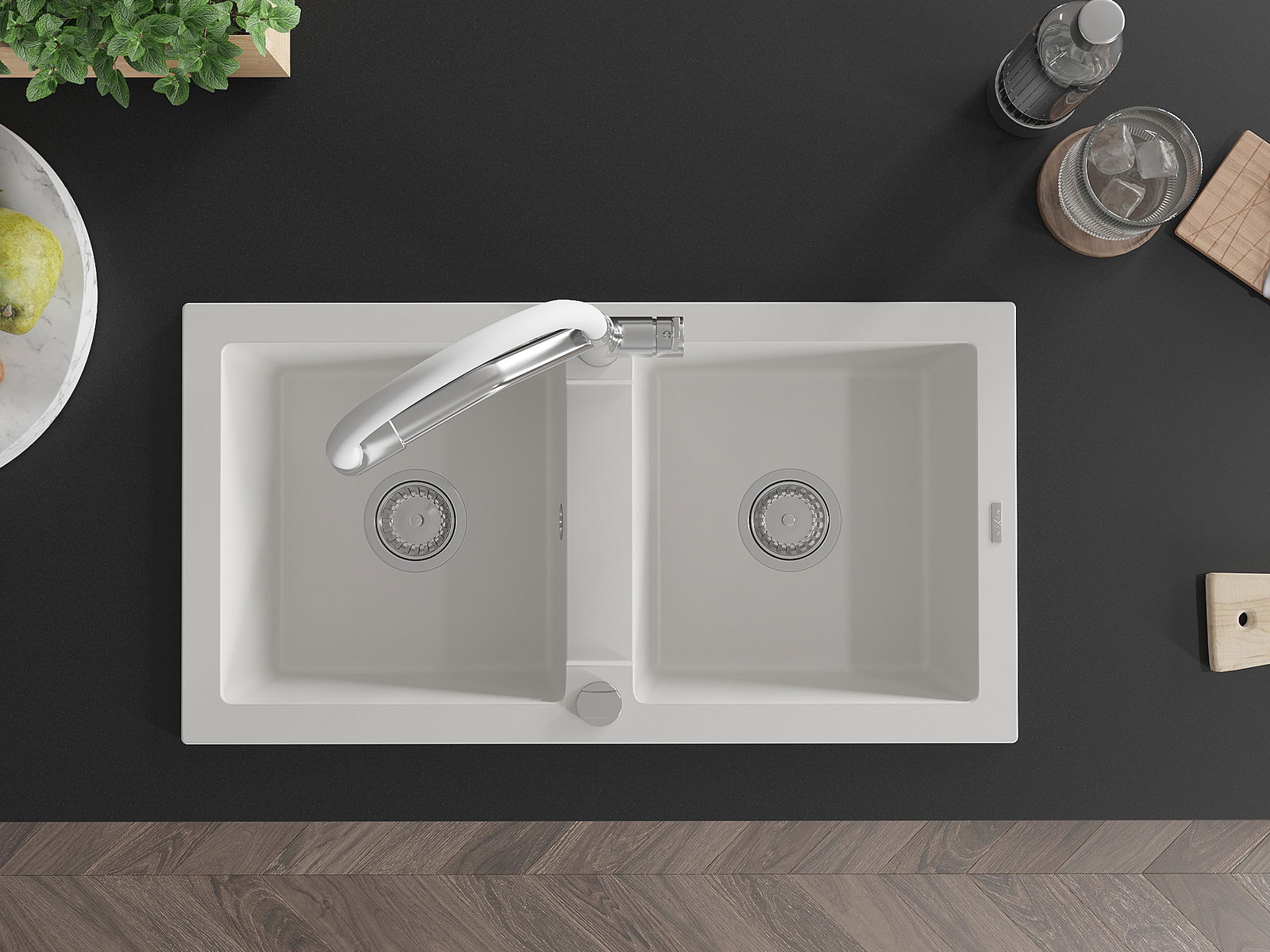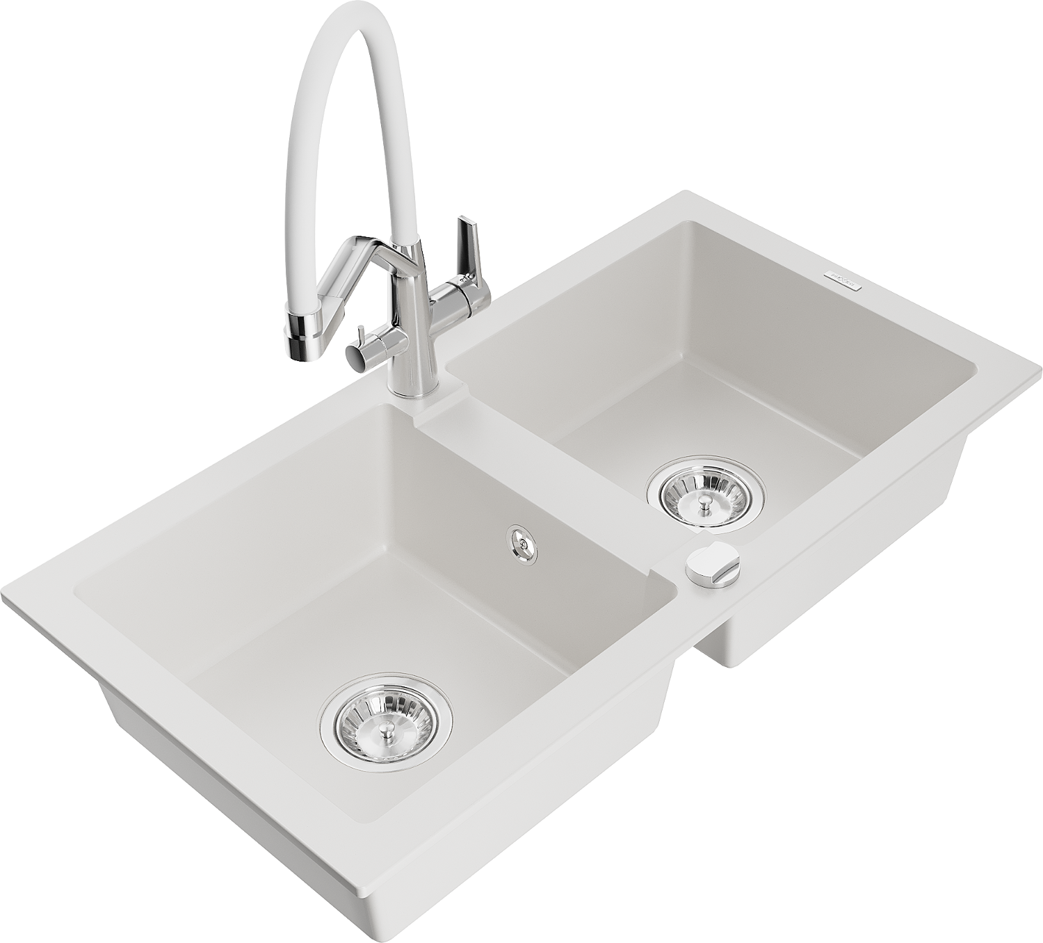 Mexen Mario гранитна кухненска мивка с 2 камери и смесител Duo, бял - 6504-20-671701-02