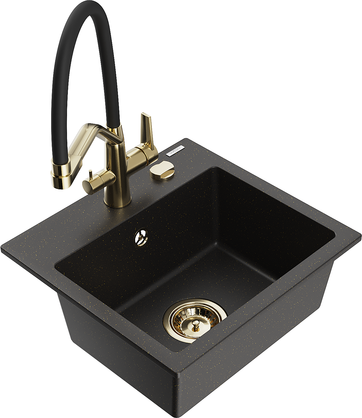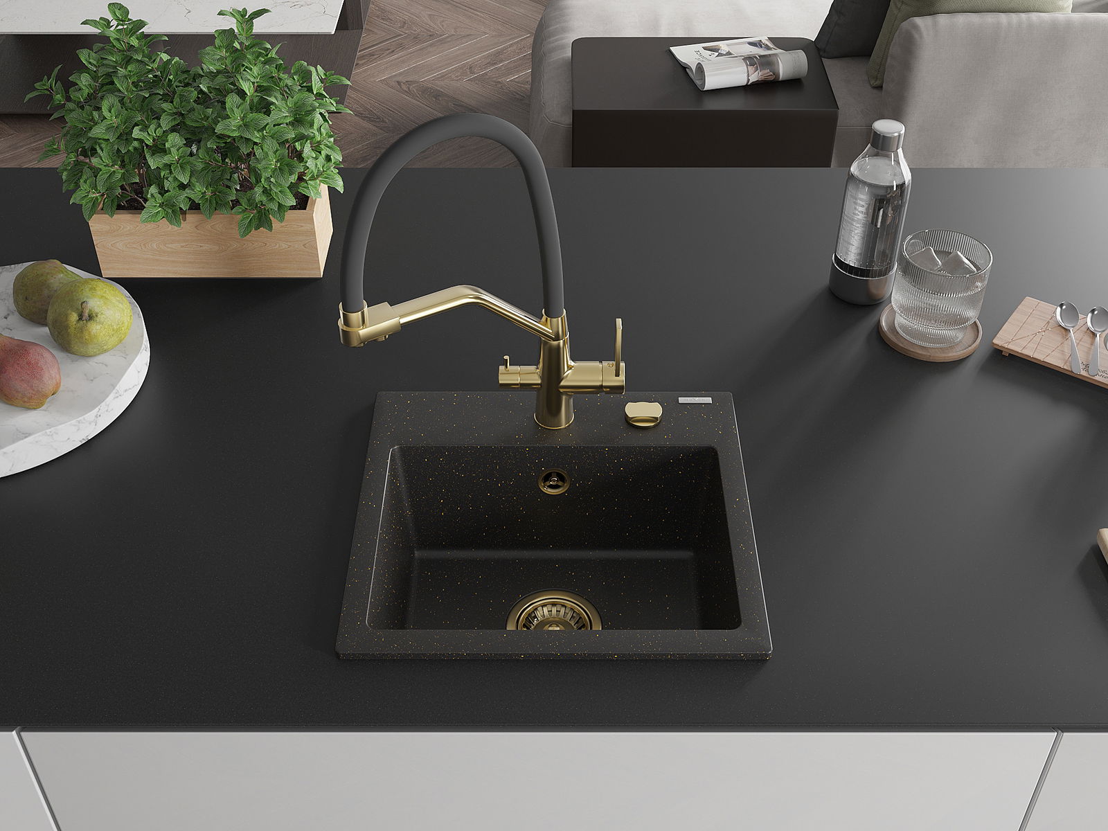 Mexen Milo гранитна мивка с една камера и кухня батерия Duo, черен/златист металик - 6505-75-671701-57-G