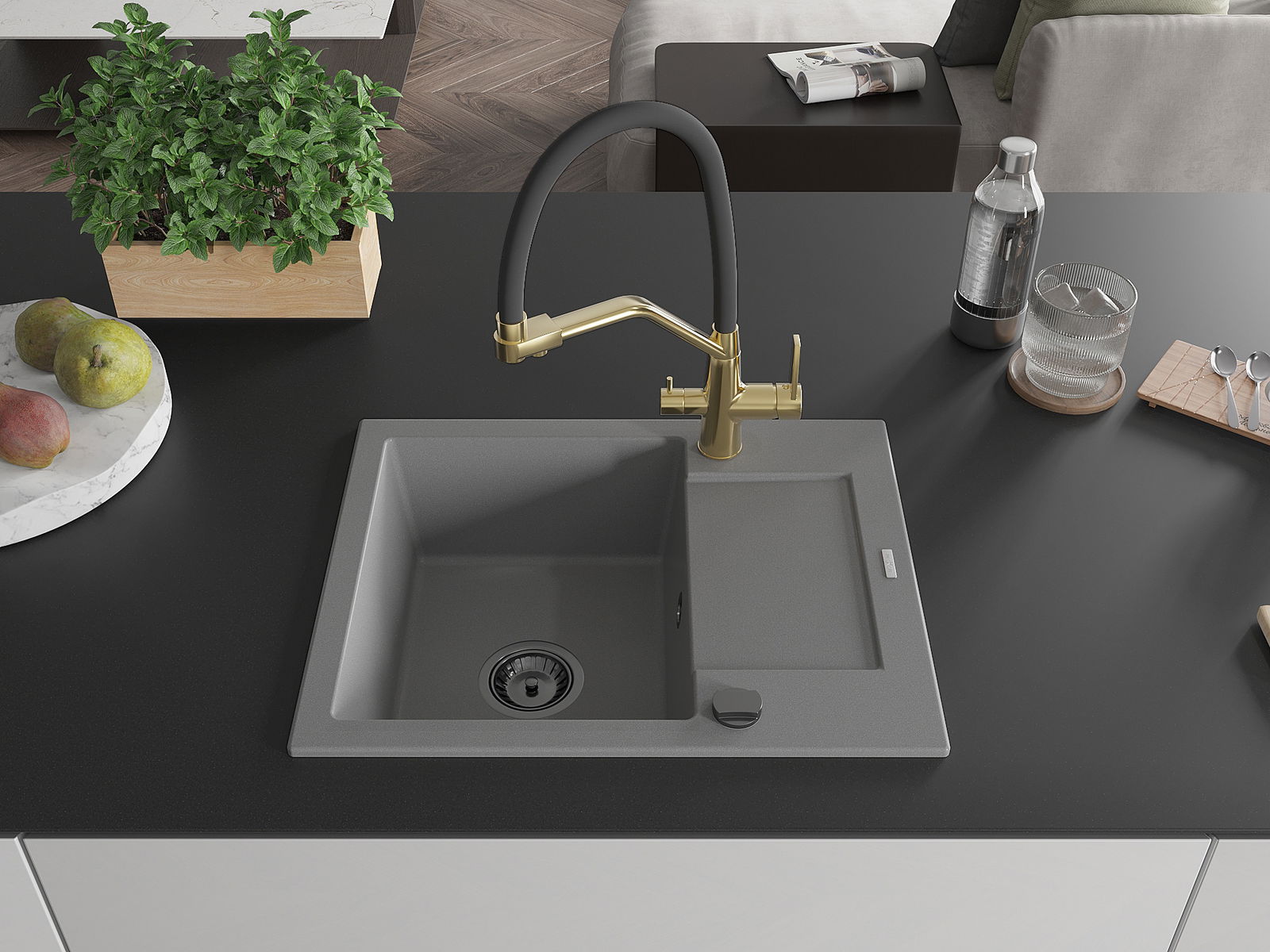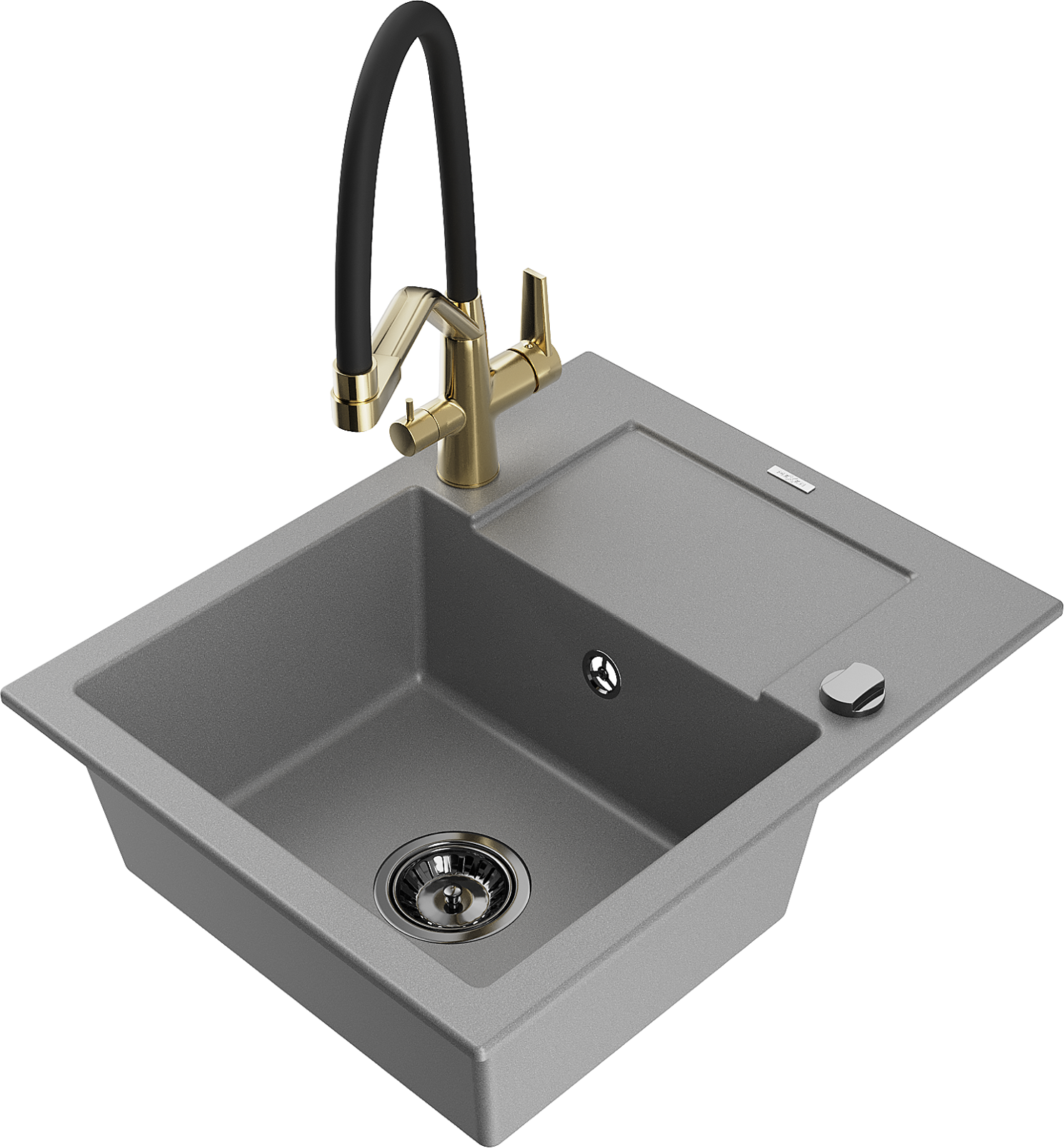 Мекзен Ензо гранитна мивка с 1 отделение и отцедник с кухненски смесител Дуо, сив - 6506-71-671701-57-B