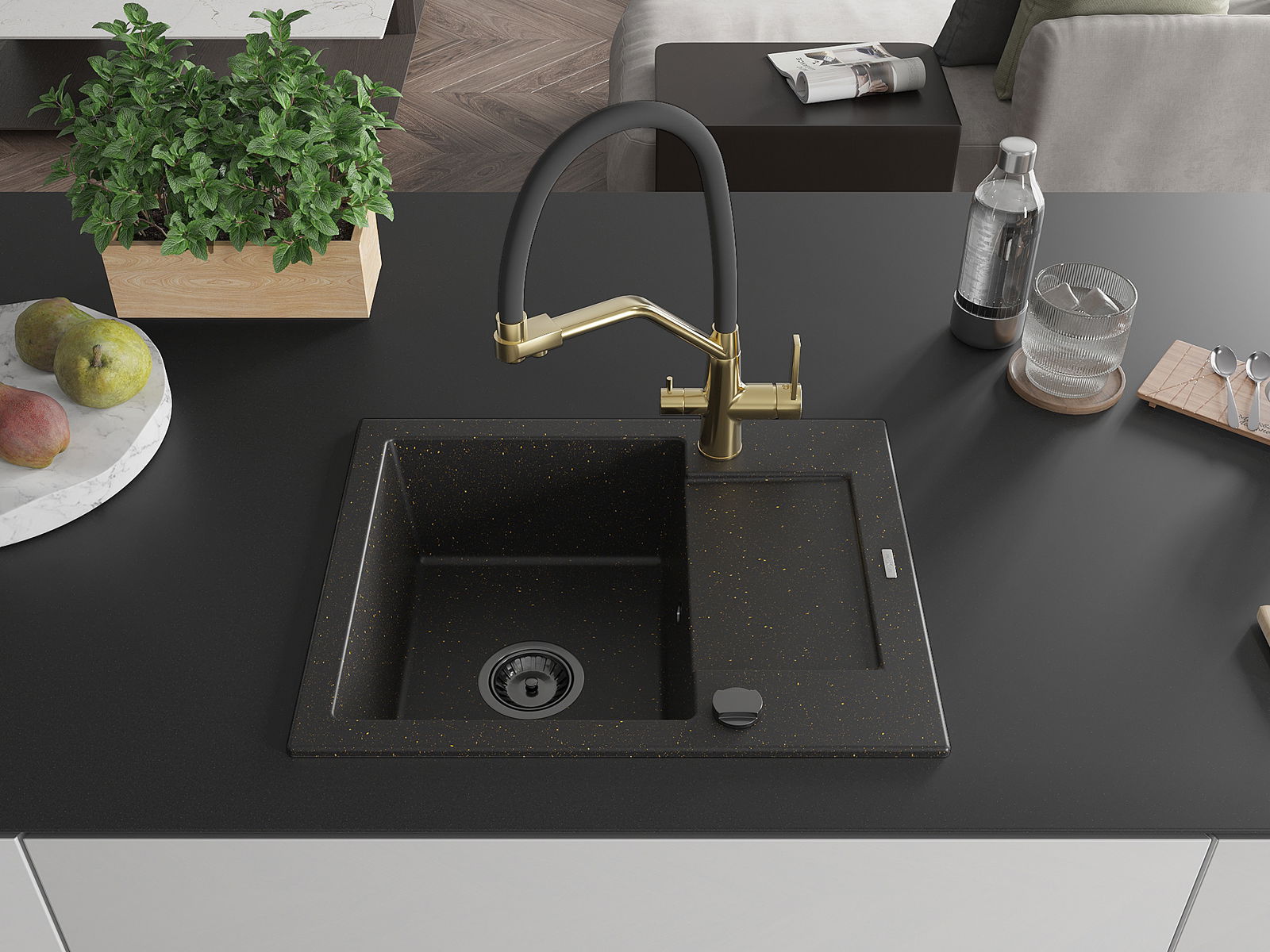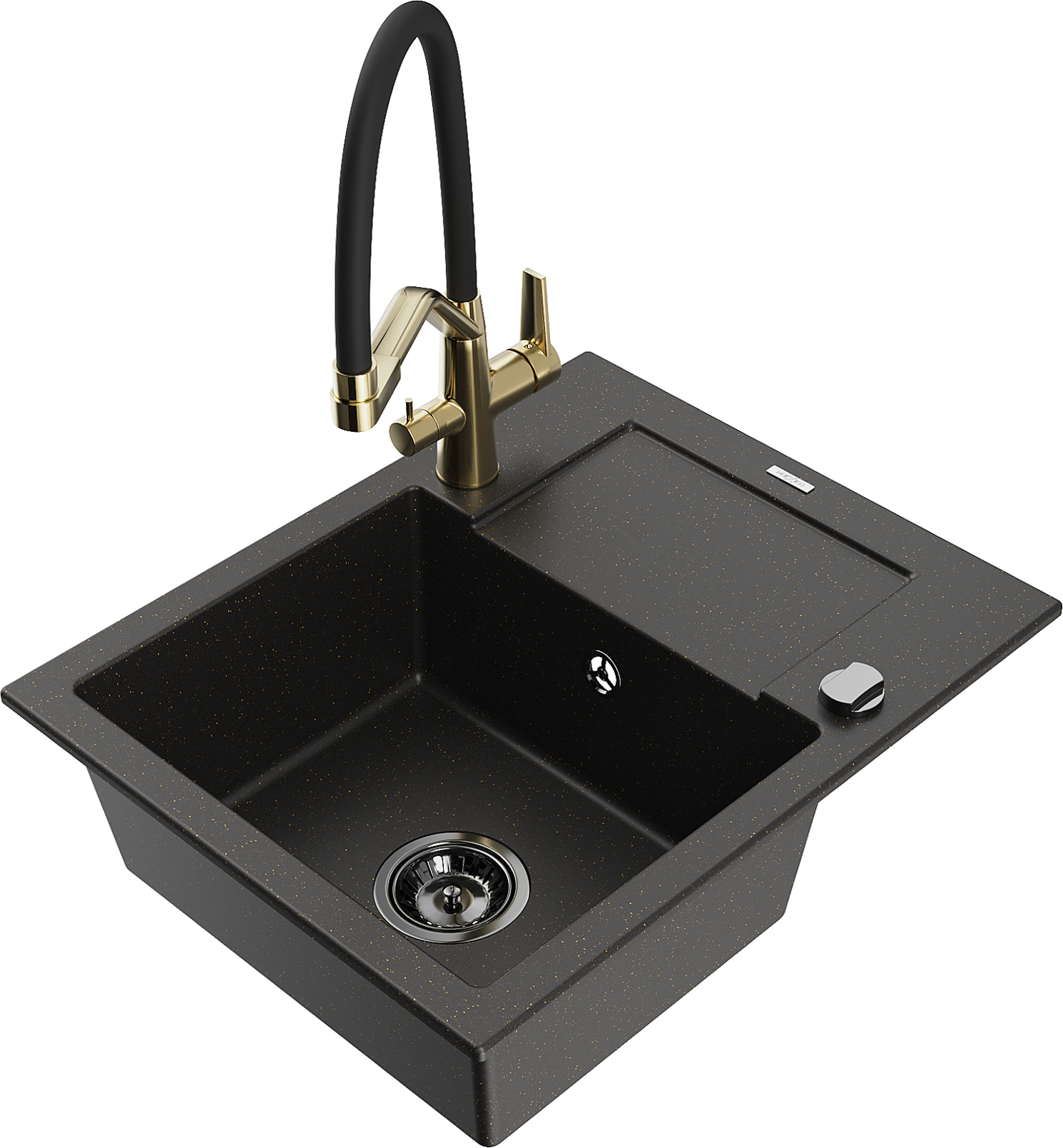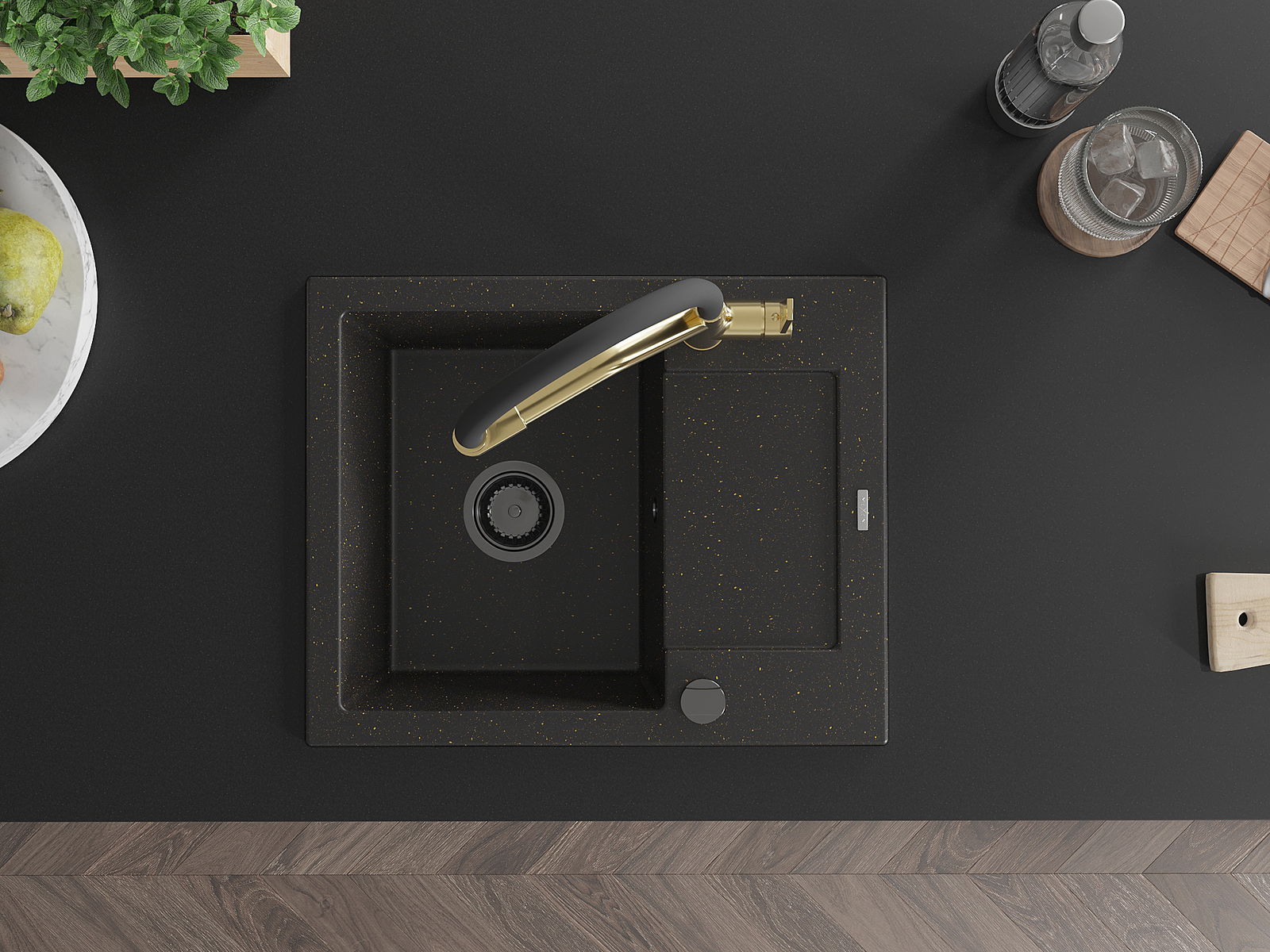 Mexen Enzo гранитна мивка с 1 отделение с отцедник и кухненски смесител Duo, черен/златен металик - 6506-75-671701-57-B