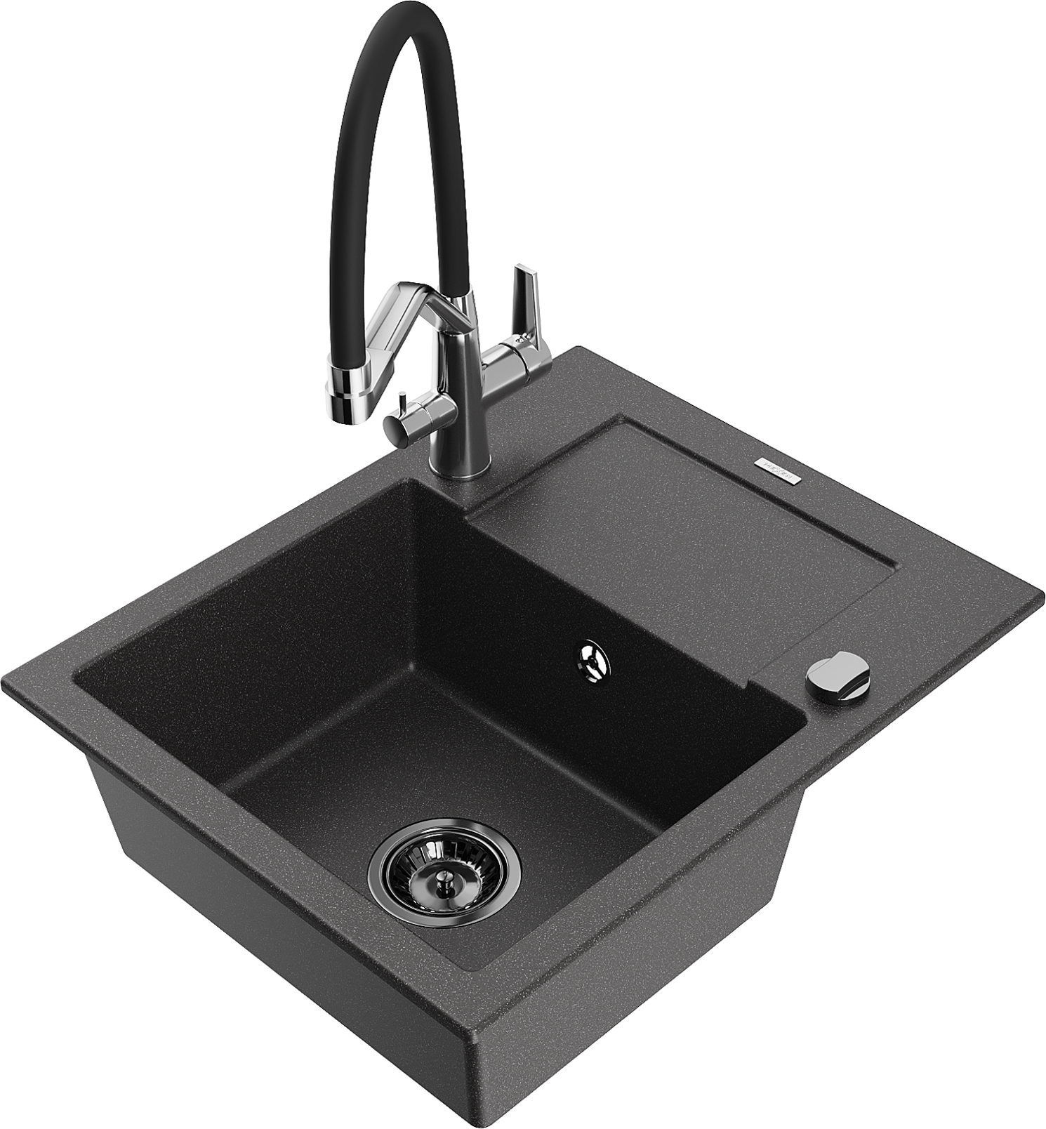 Гранитна мивка Mexen Enzo с една камера с отцедник и кухненски смесител Duo, черен на пръски - 6506-76-671701-07-B