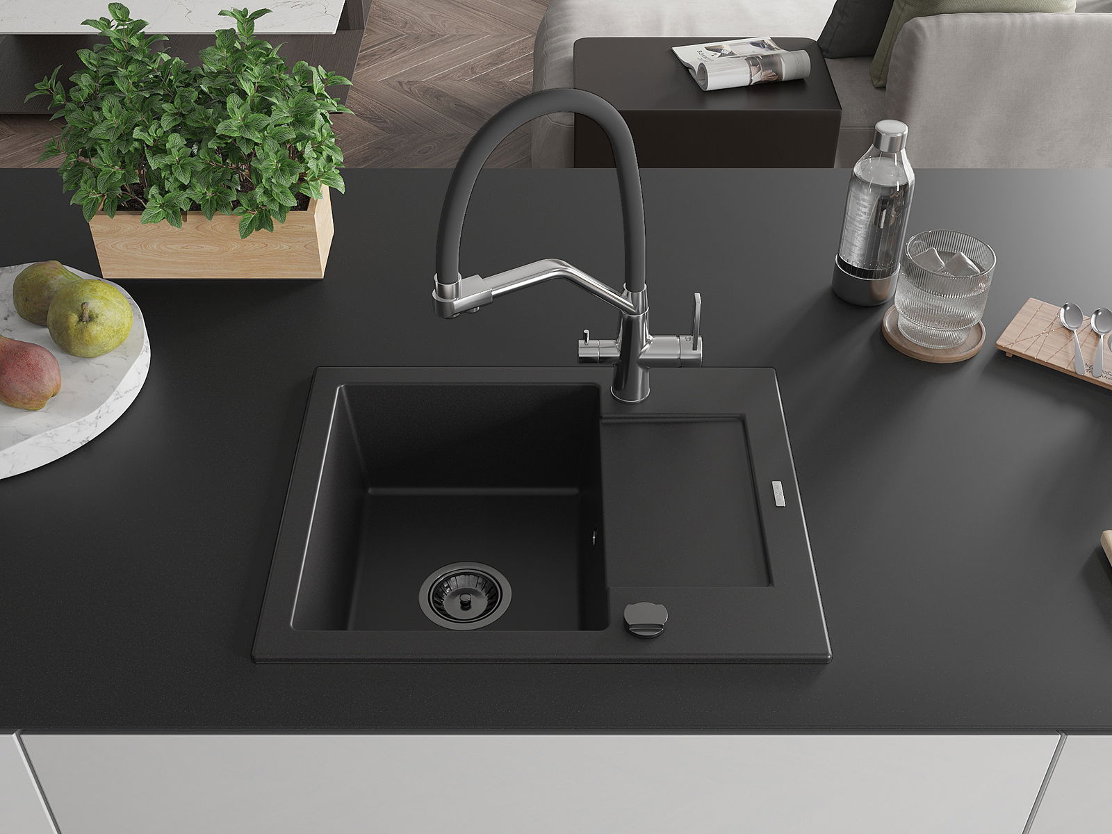 Мивката е направена от висококачествен гранит. Това е елегантно и най -вече практично допълнение към всяка кухня, независимо от нейния стил. Висококачествената и гранитна издръжливост осигуряват много години употреба.
