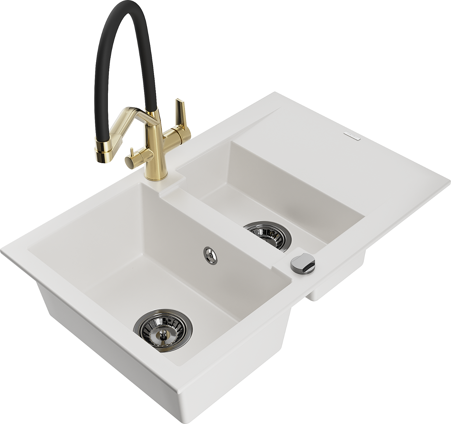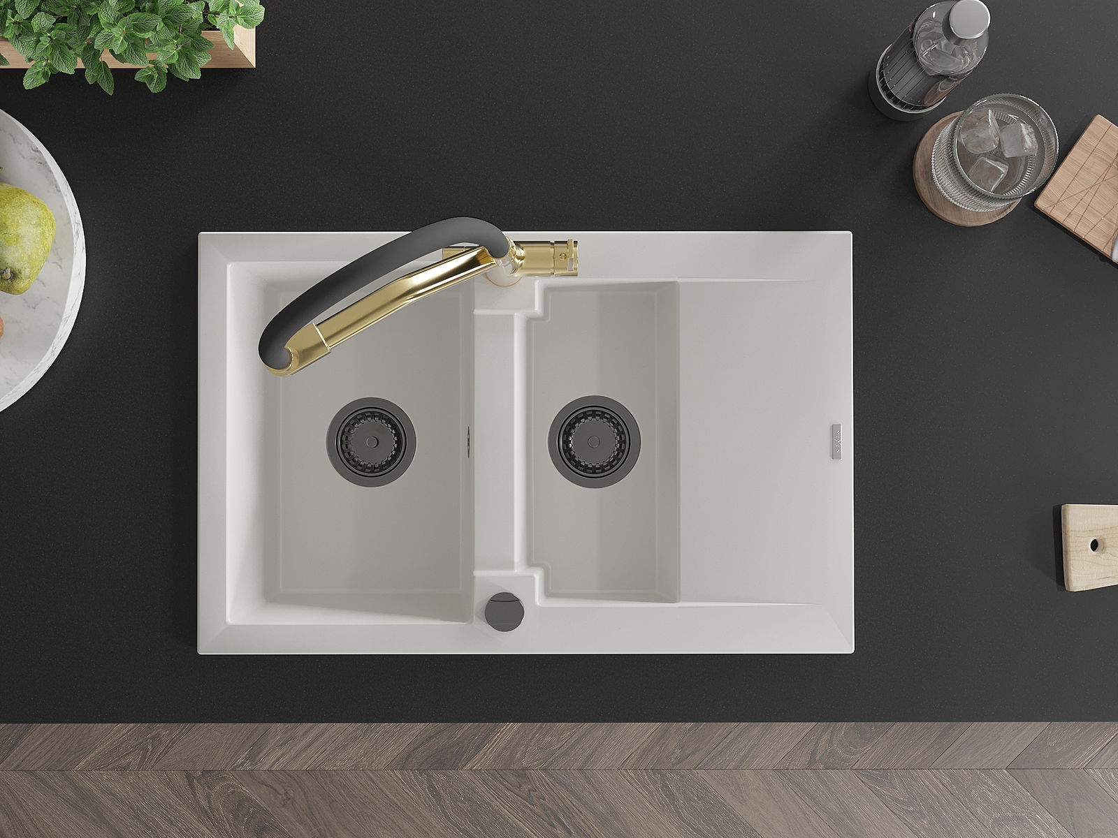 Mexen Gaspar кухненска мивка от гранит с 1,5 камери и отцедник с кухненски кран Duo, бял - 6507-20-671701-57-B