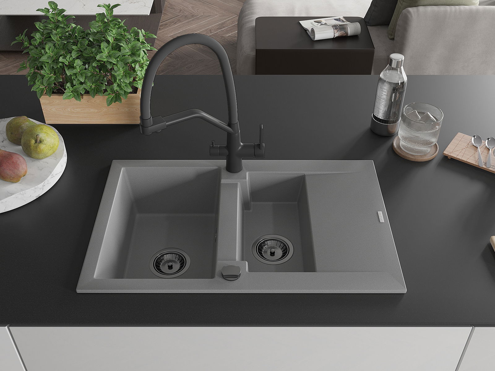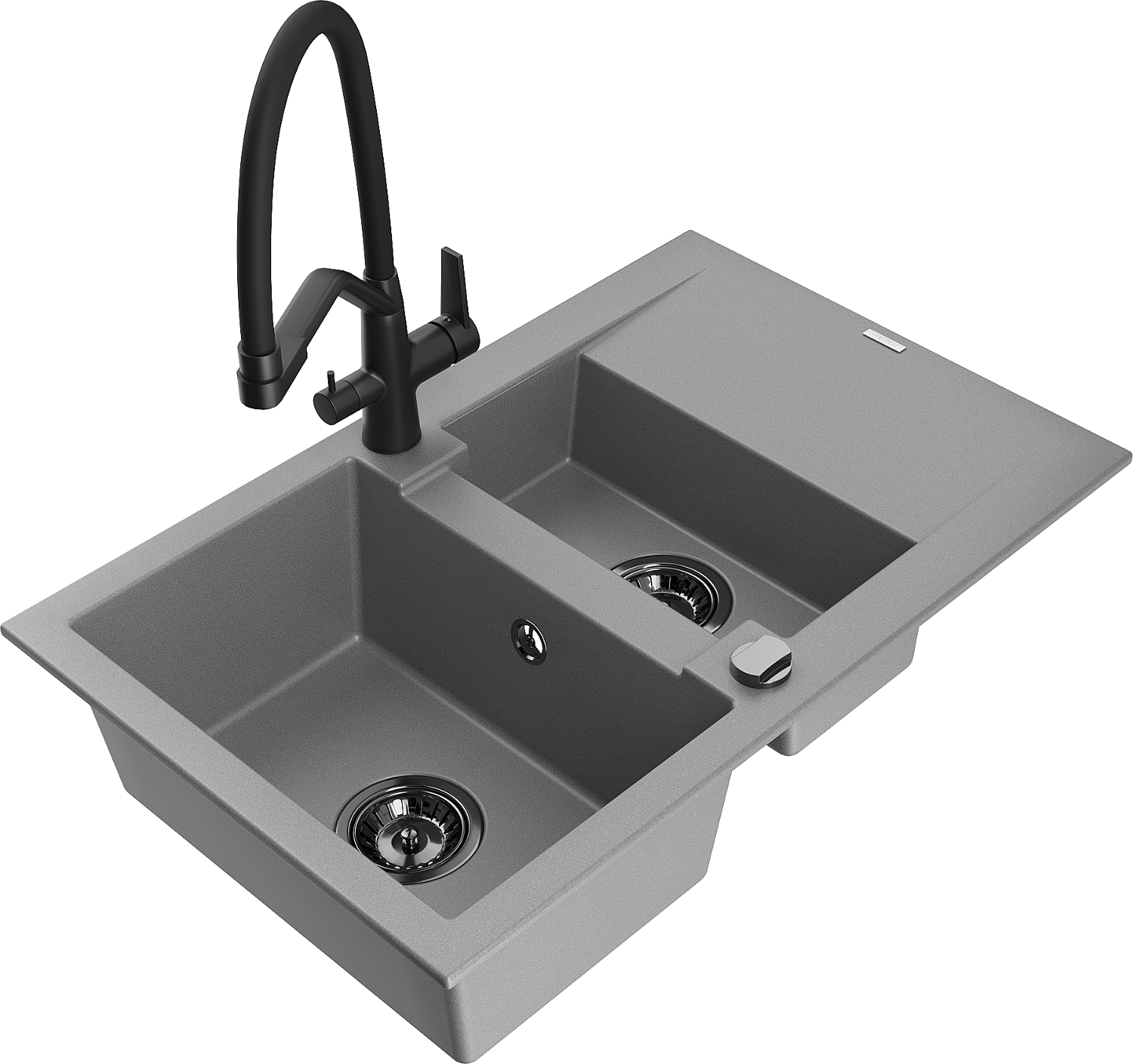 Mexen Gaspar гранитна мивка 1,5-камерна с отцедник и кухненски смесител Duo, сив - 6507-71-671701-70-B
