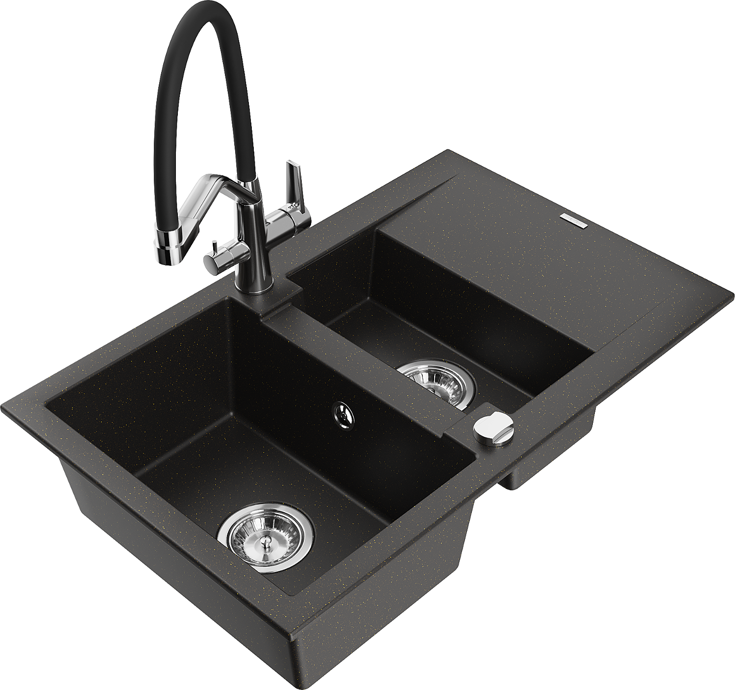 Mexen Gaspar гранитна мивка с 1,5 камери и отцеждач с кухненски смесител Duo, черно/златист металик - 6507-75-671701-07