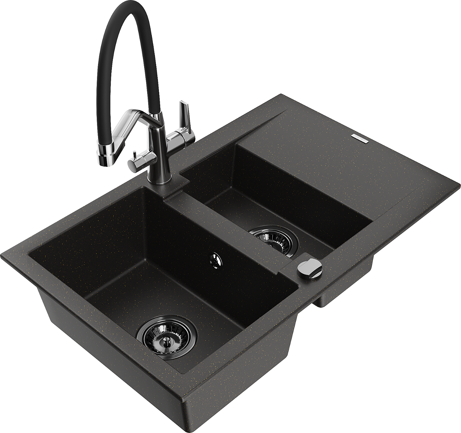 Мивка от гранит Mexen Gaspar с 1,5 камери, отцедник и кухненски смесител Duo, черен/златист металик - 6507-75-671701-07-B