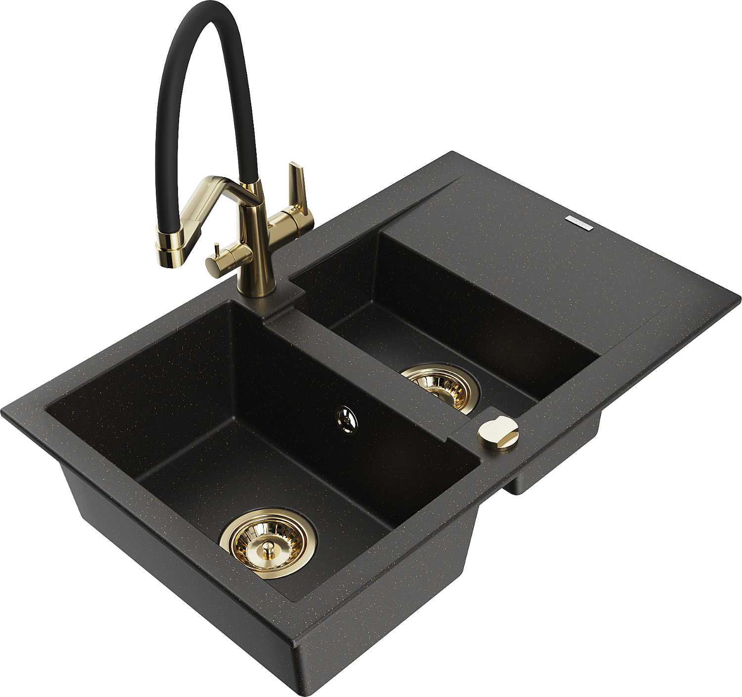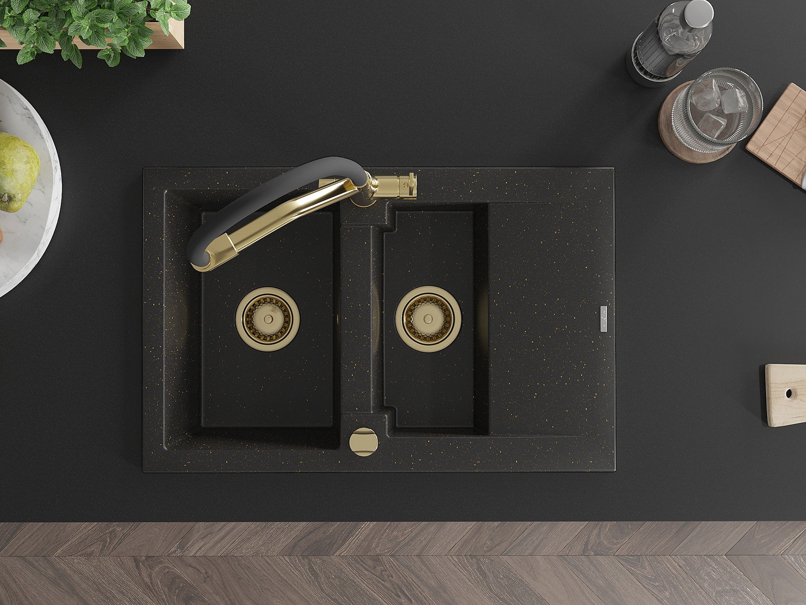 Mexen Gaspar гранитна мивка с 1,5 камери със сушилник и кухня смесител Duo, черно/златист металик - 6507-75-671701-57-G