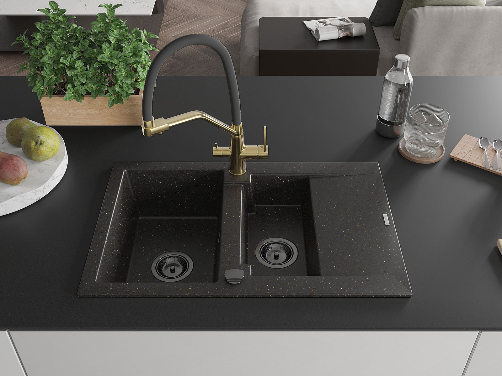 Mexen Gaspar гранитна мивка, 1,5 камери с отцедник и кухненски смесител Duo, черно/златен металик - 6507-75-671701-57-B