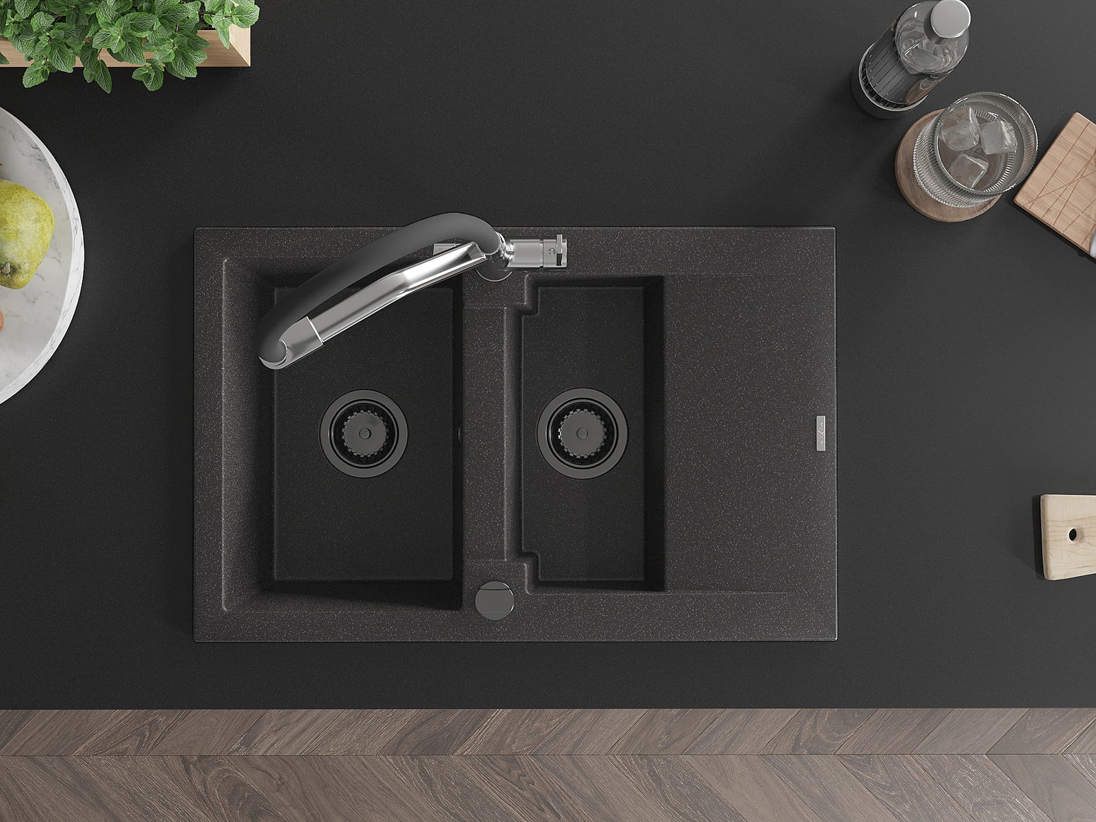 Mexen Gaspar гранитна кухненска мивка с 1,5 камери с отцедник и кухненски смесител Duo, черен на пръски - 6507-76-671701-07-B