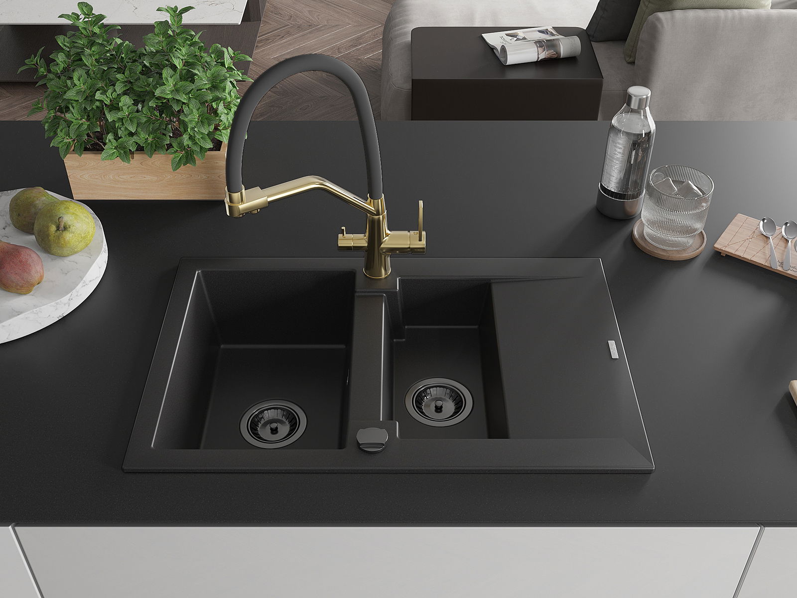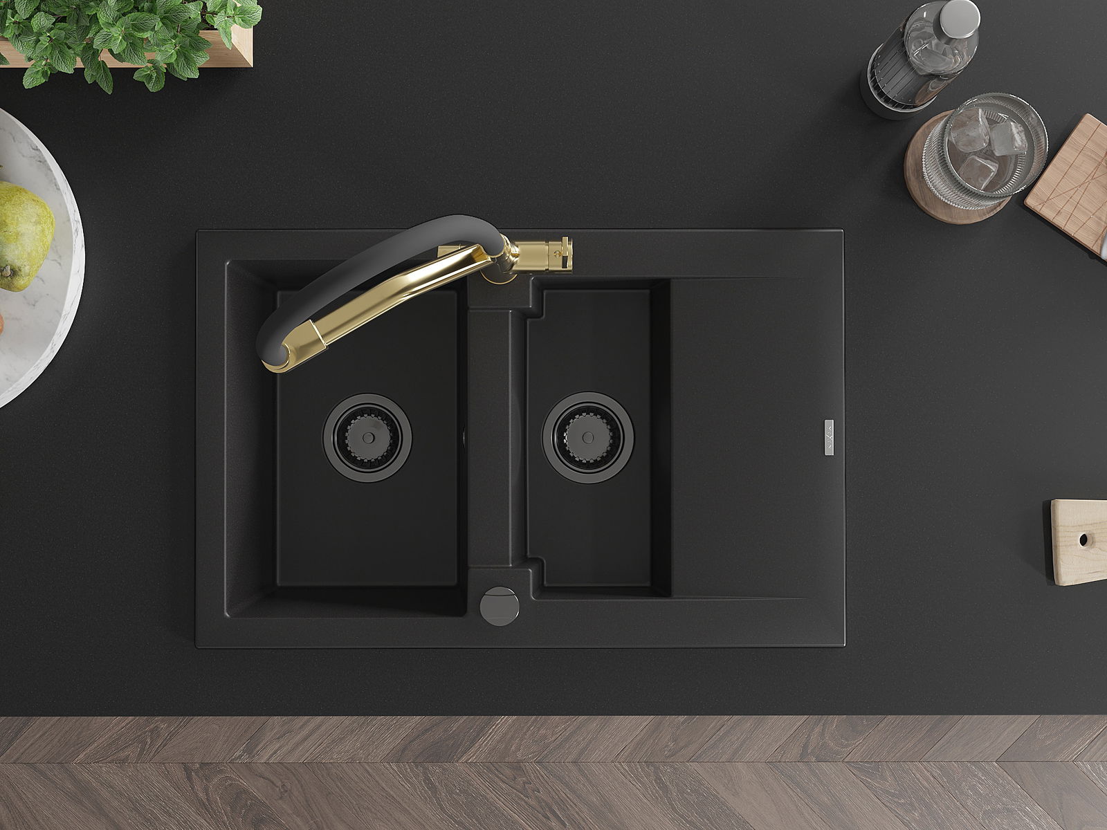 Mexen Gaspar гранитна мивка с 1,5 камери, с отцедник и кухненски смесител Duo, черна - 6507-77-671701-57-B